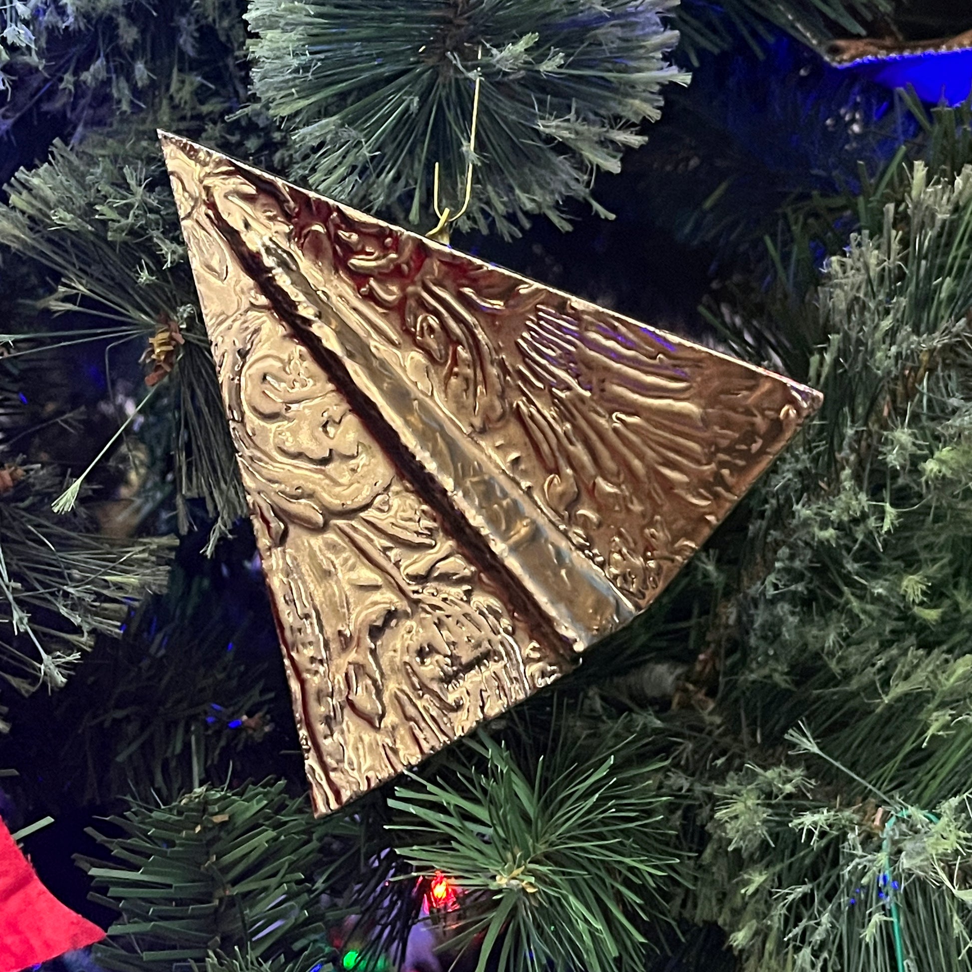 Fine art for your tree! Decorate your tree with this unique ceramic paper plane ornament. The ornament is inspired by gold foil wrapping paper. The clay surface is embossed with a flowing ornamental filigree pattern from a printing plate created by the artist. The thin clay sheet is then folded and trimmed to resemble a paper plane. A luxurious coating of metallic gold glaze is brushed over the upper surface before firing in a kiln. To hang your ornament on the tree, a thin metal strip is added to the back for the wire hook.