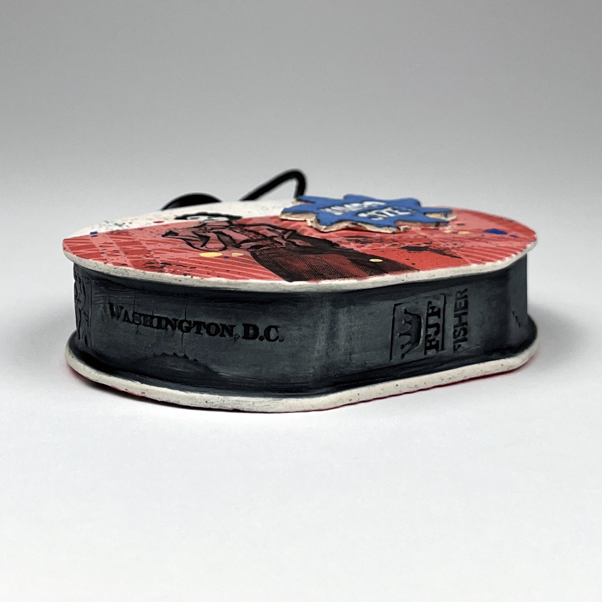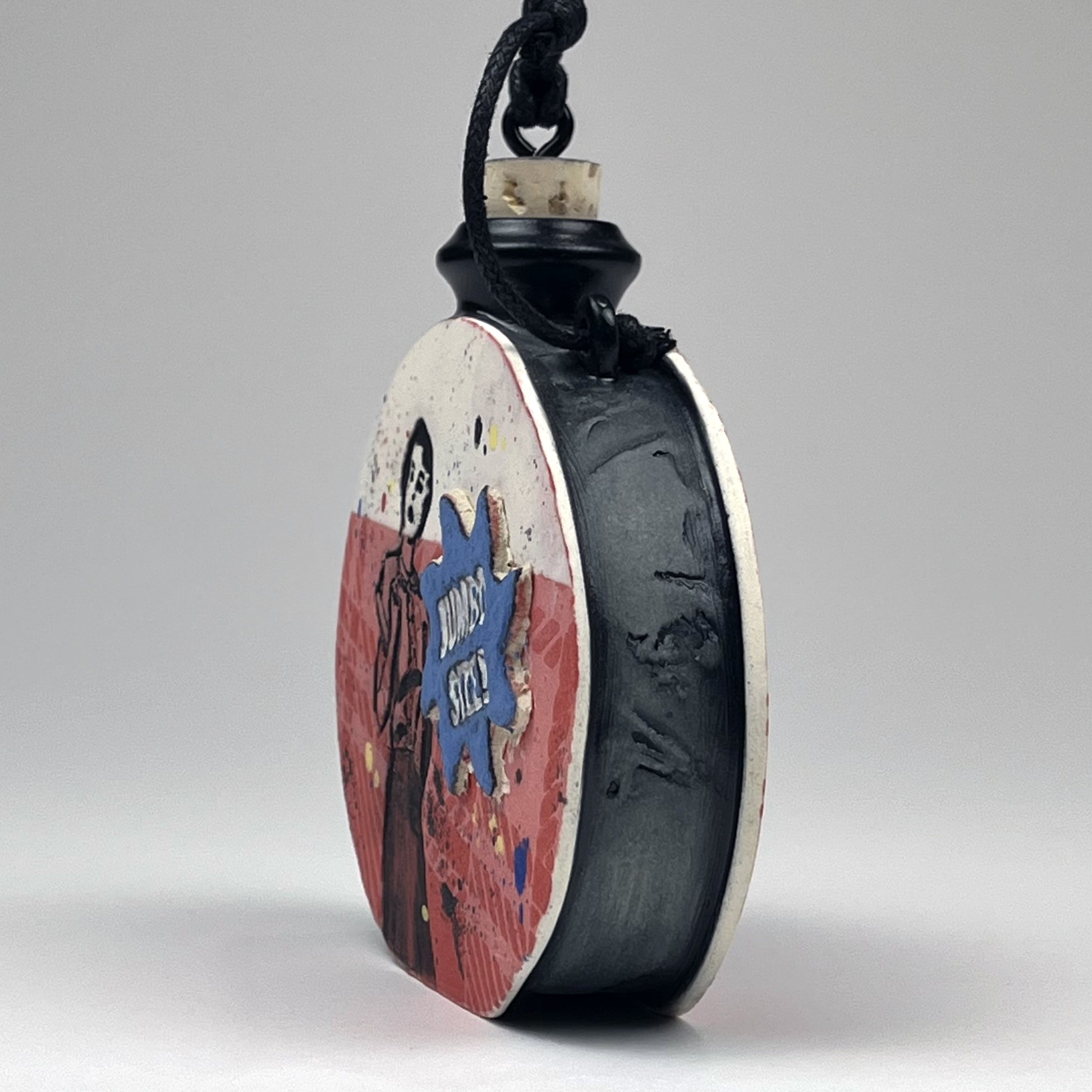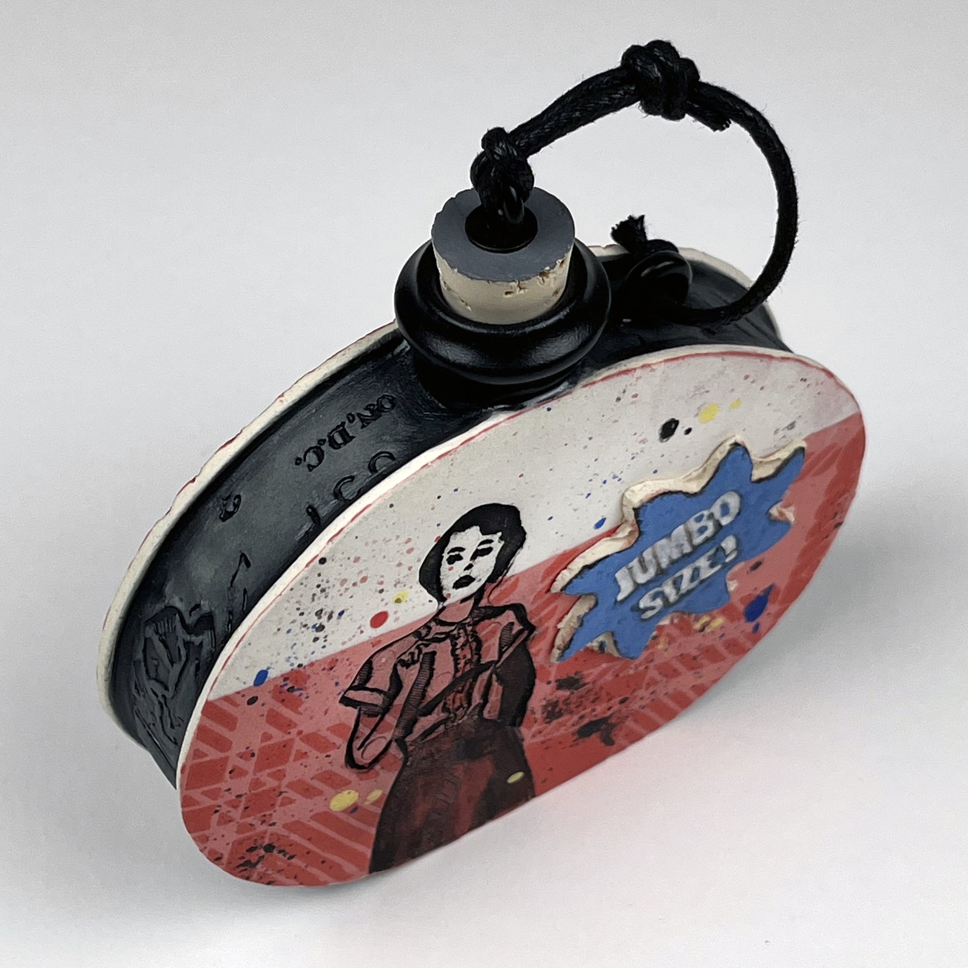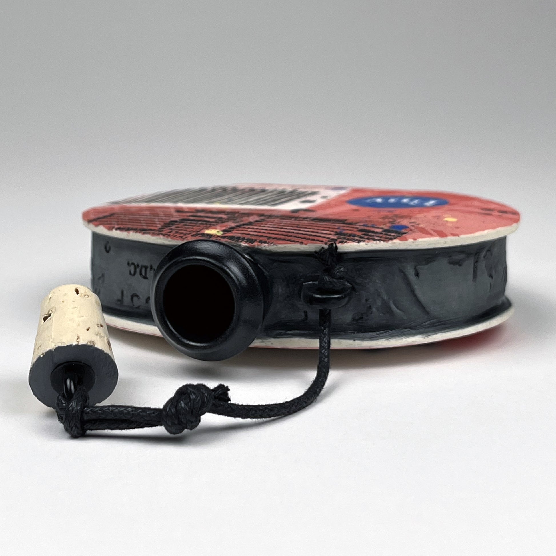 The primary clay body is porcelain. The underlying color background is built by layering patterns of underglaze to create the main design. Text and some graphics are created by impressing the clay with print plates. After bisque firing, the impressions are colored with washes of underglaze. Interior of the flask is glazed with a food-safe satin black glaze. After final firing to cone 5, the cork stopper and cord are added.