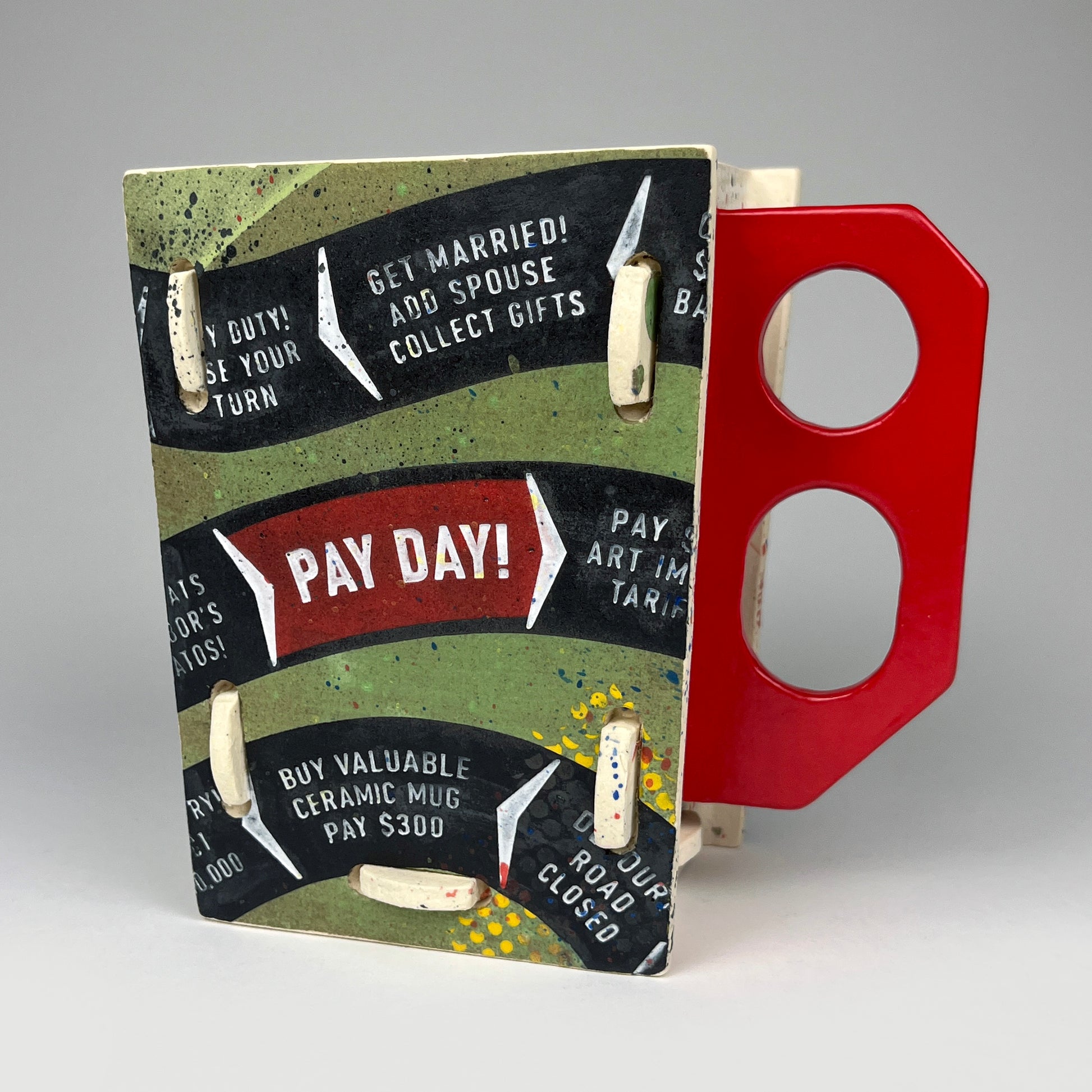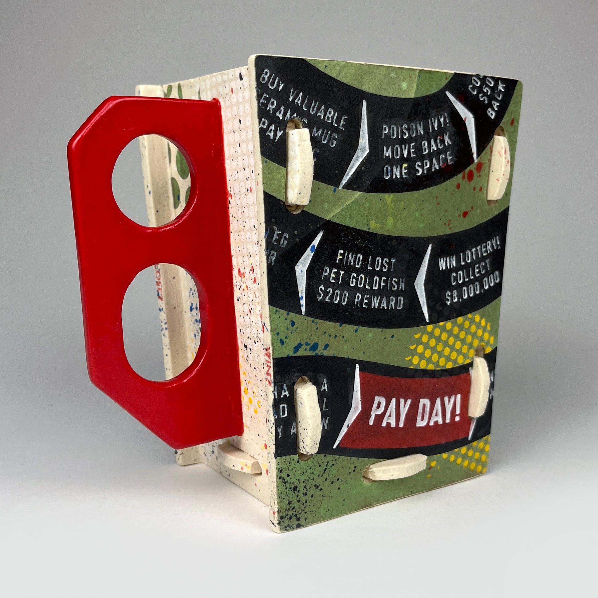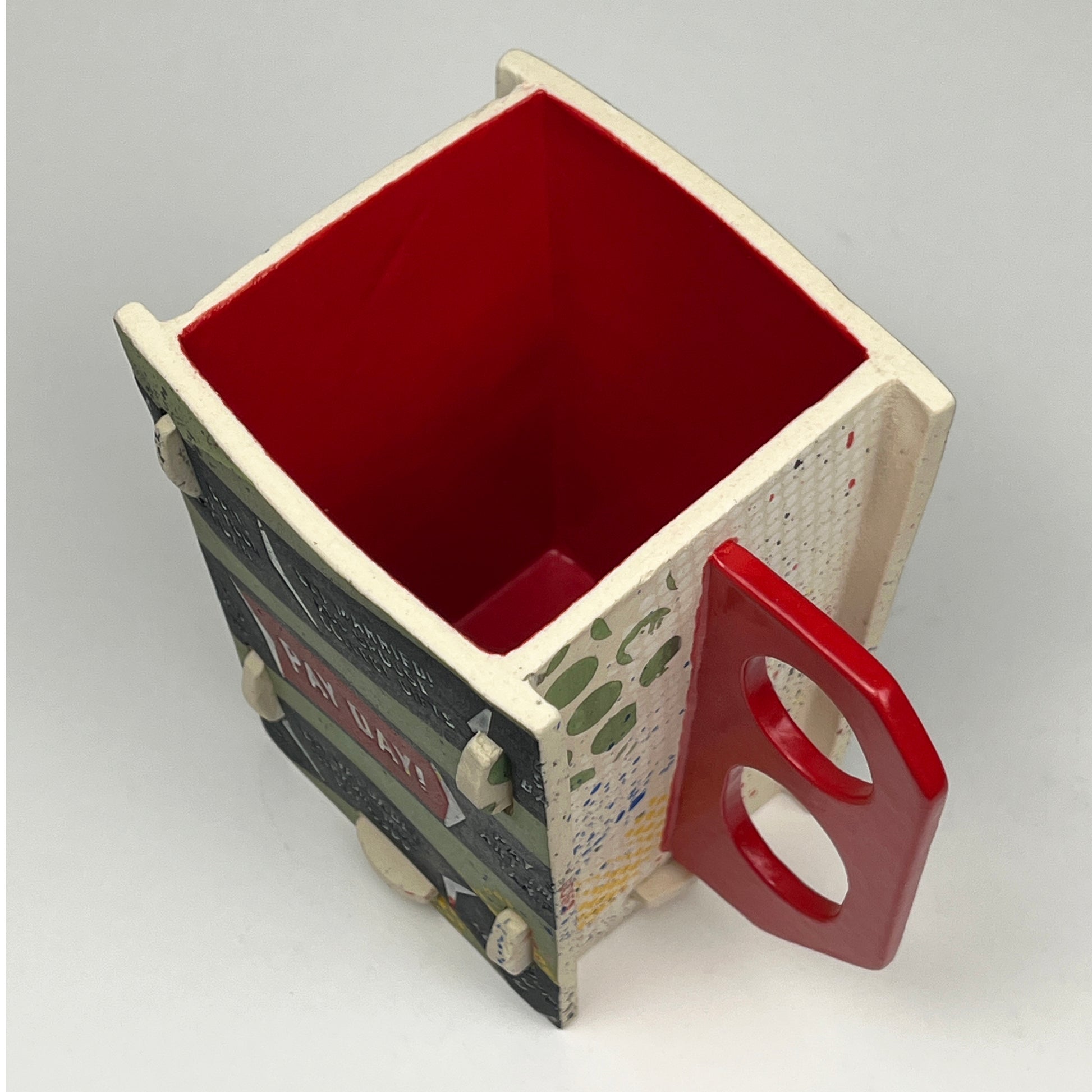 PROCESS: This mug is made from a paper-clay slab with multiple layers of stenciled underglaze patterns applied to decorate the clay surface. The graphics are created with a letterpress print plate created by the artist. The print plate is impressed into the clay followed by hand-brushed underglaze applied in the recessed area. The mug form is then assembled from 6 pieces of slab clay, precisely trimmed to fit together. The mug is leak-proof.