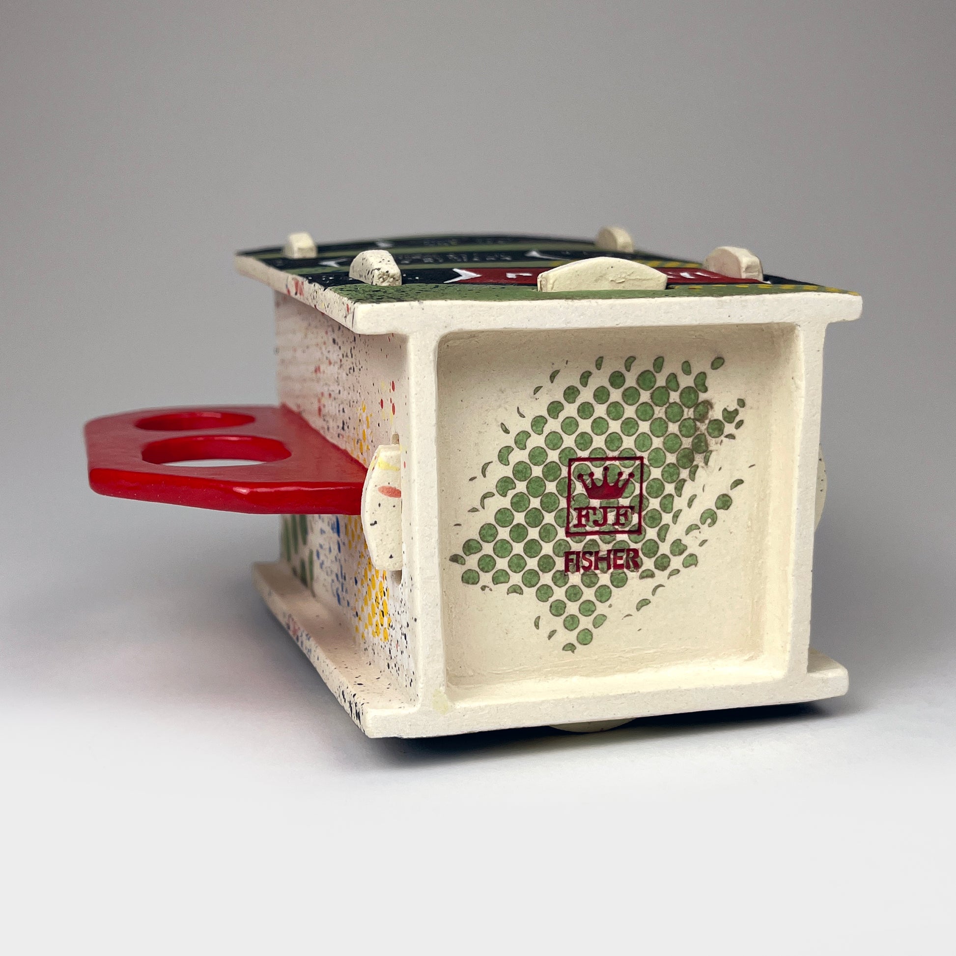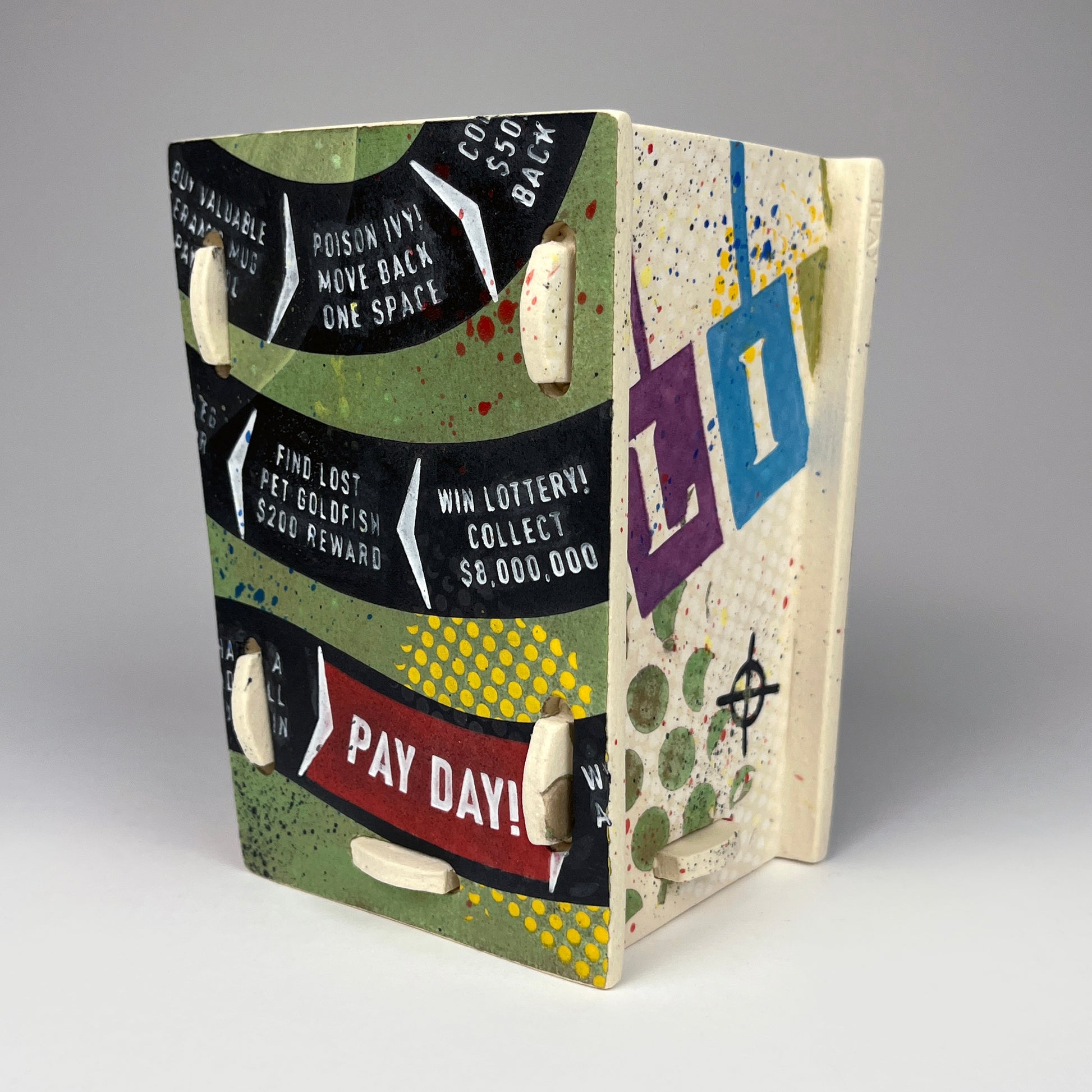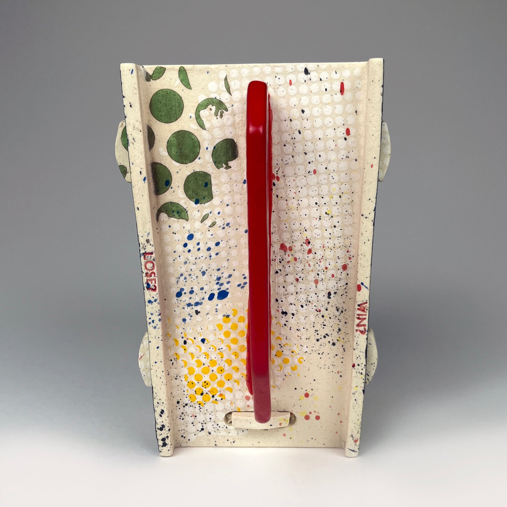 PROCESS: This mug is made from a paper-clay slab with multiple layers of stenciled underglaze patterns applied to decorate the clay surface. The graphics are created with a letterpress print plate created by the artist. The print plate is impressed into the clay followed by hand-brushed underglaze applied in the recessed area. The mug form is then assembled from 6 pieces of slab clay, precisely trimmed to fit together. The mug is leak-proof.