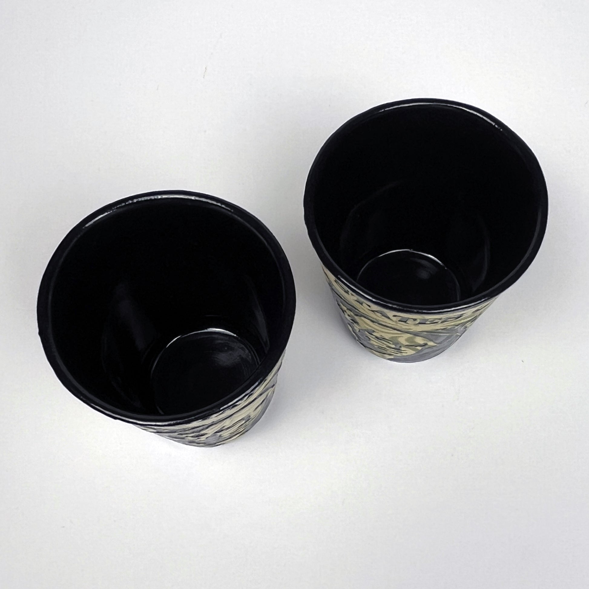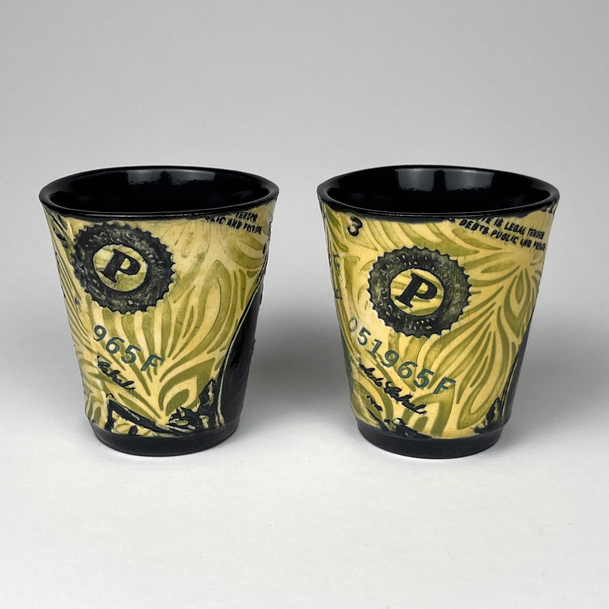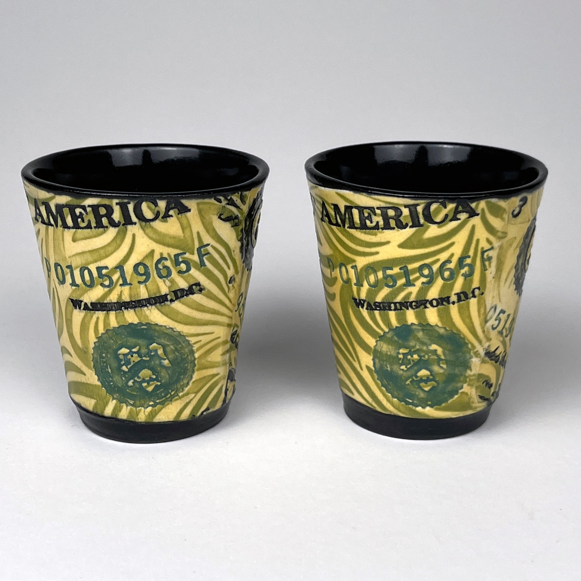 PROCESS: Cup is made from a stoneware slab with multiple layers of stenciled underglaze patterns applied. The impressed dollar image has black and teal washes in the recessed area. The form is wrapped around a cylinder to create cup. Foot and rim are adjusted on the wheel. Transparent gloss glaze applied outside with black gloss glaze on interior