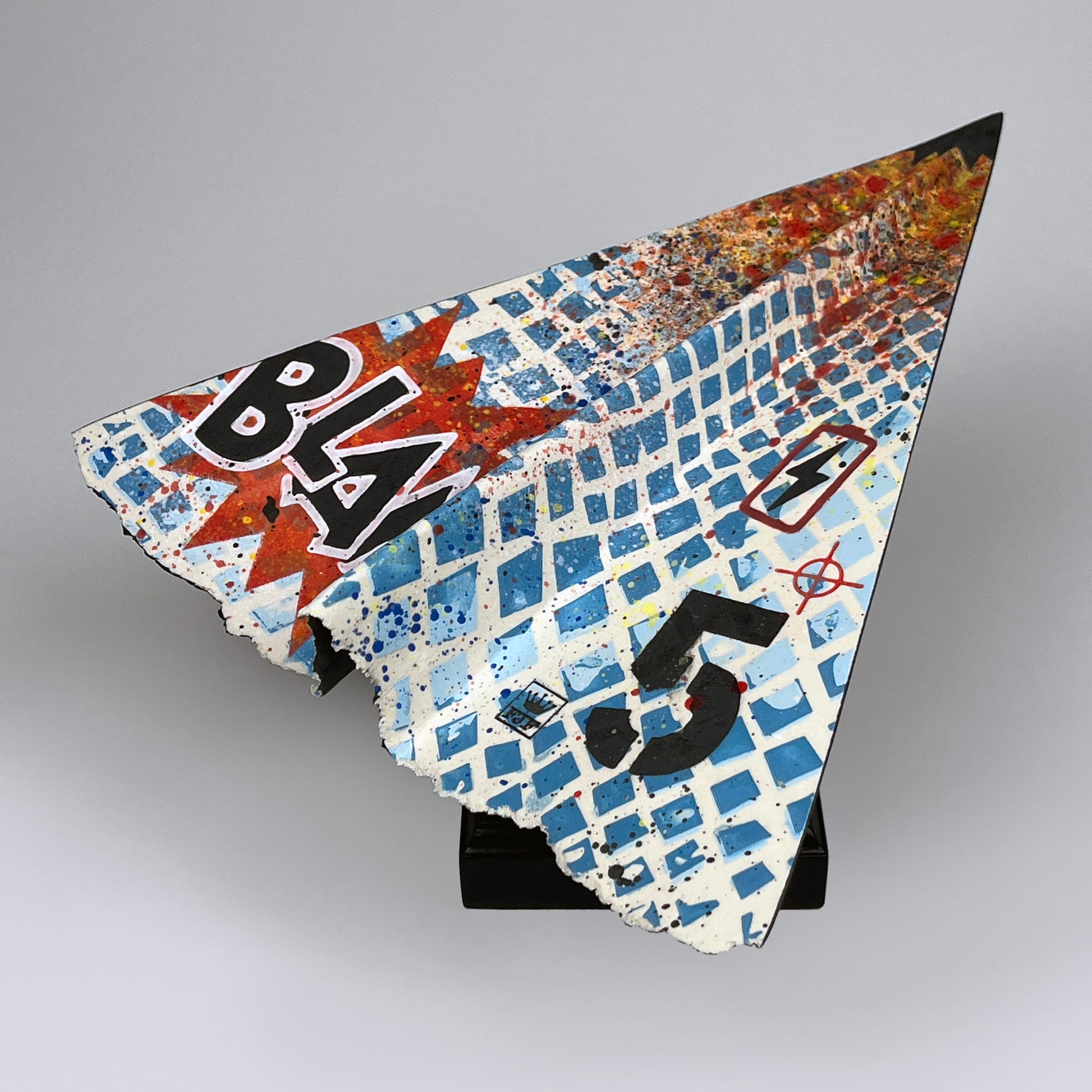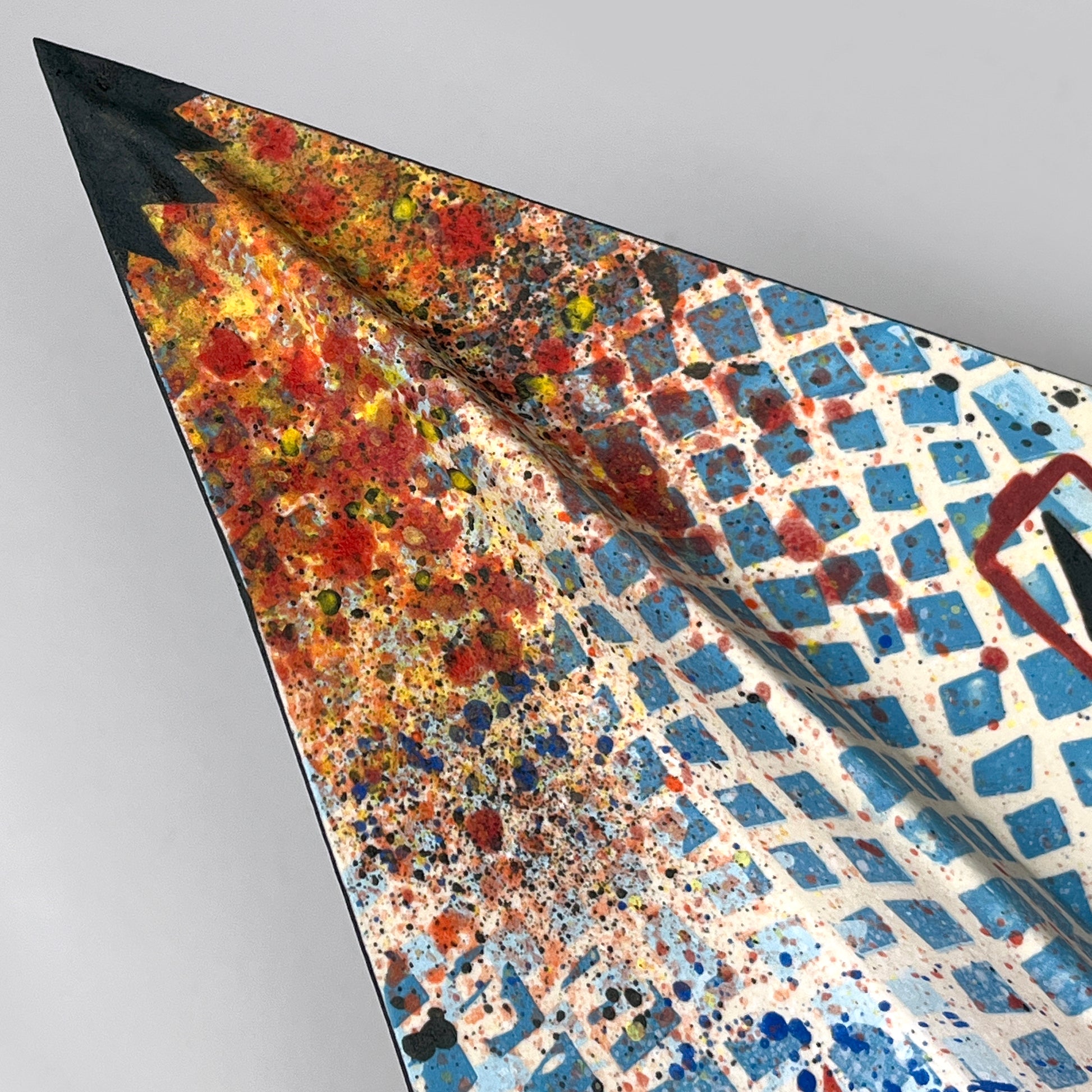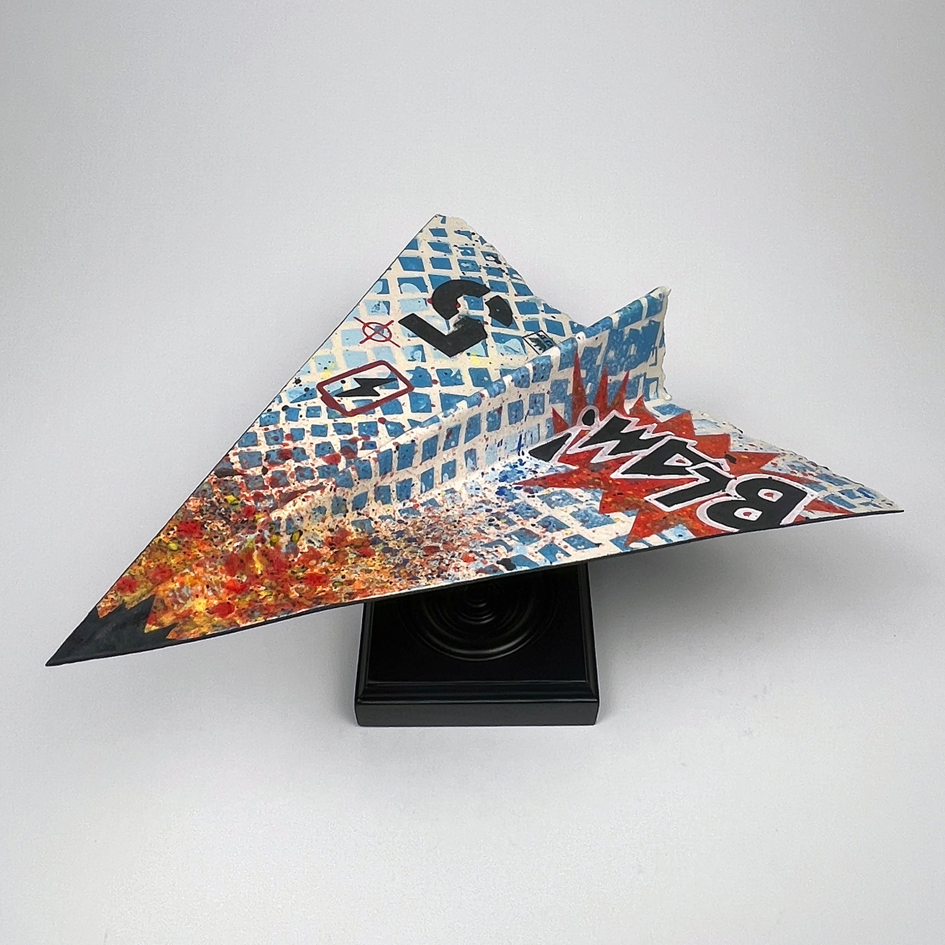 PAPER PLANES: Upon close inspection, these planes are folded from extremely thin sheets of clay. The surfaces of the planes are covered in graphics from vintage newspapers, advertisements, currency, comics, or any variety of paper ephemera. Some planes are glazed in black or red or multiple colors. The plane shapes are similar to the dart-style paper airplanes we made as children — folded from coloring book pages or last week’s math assignment.