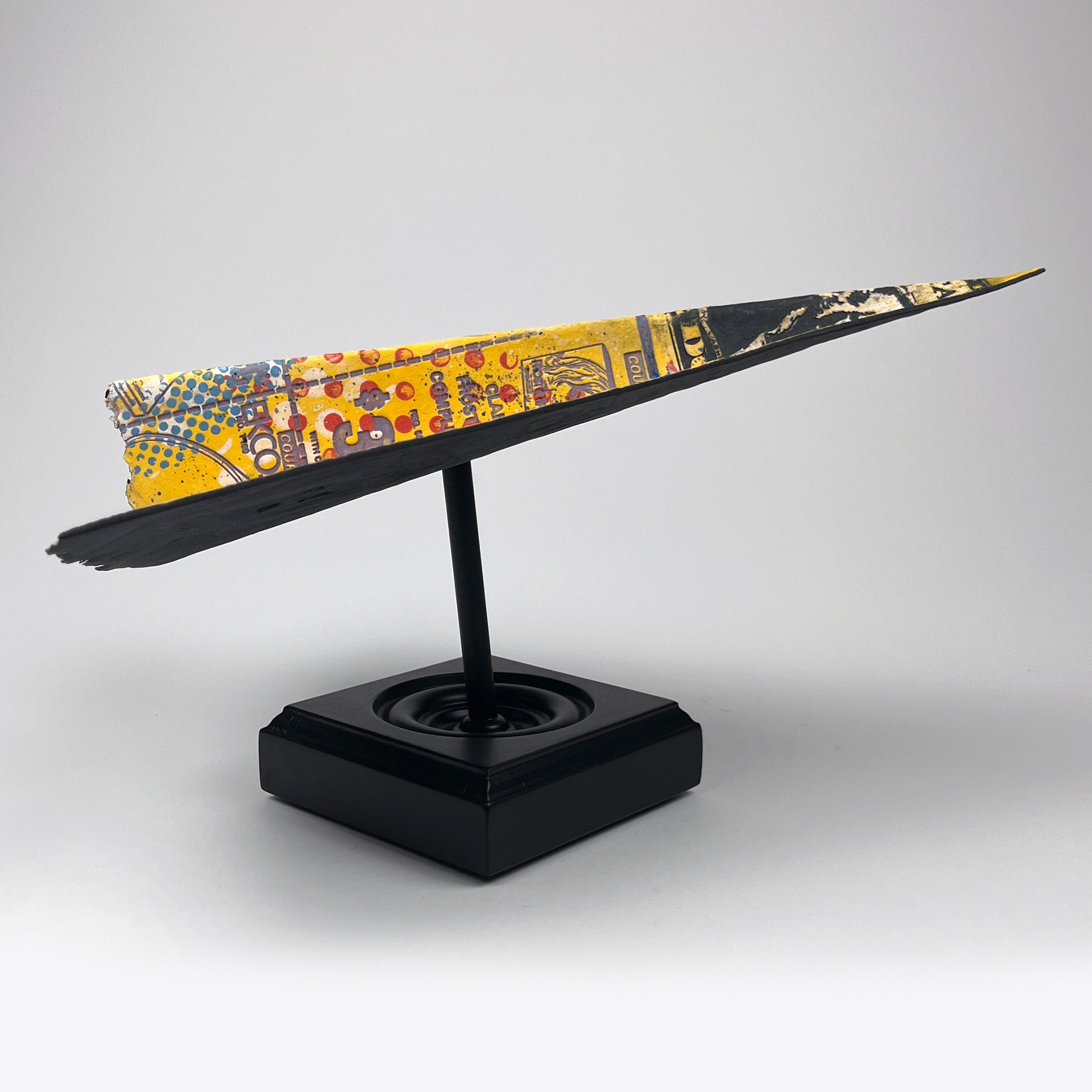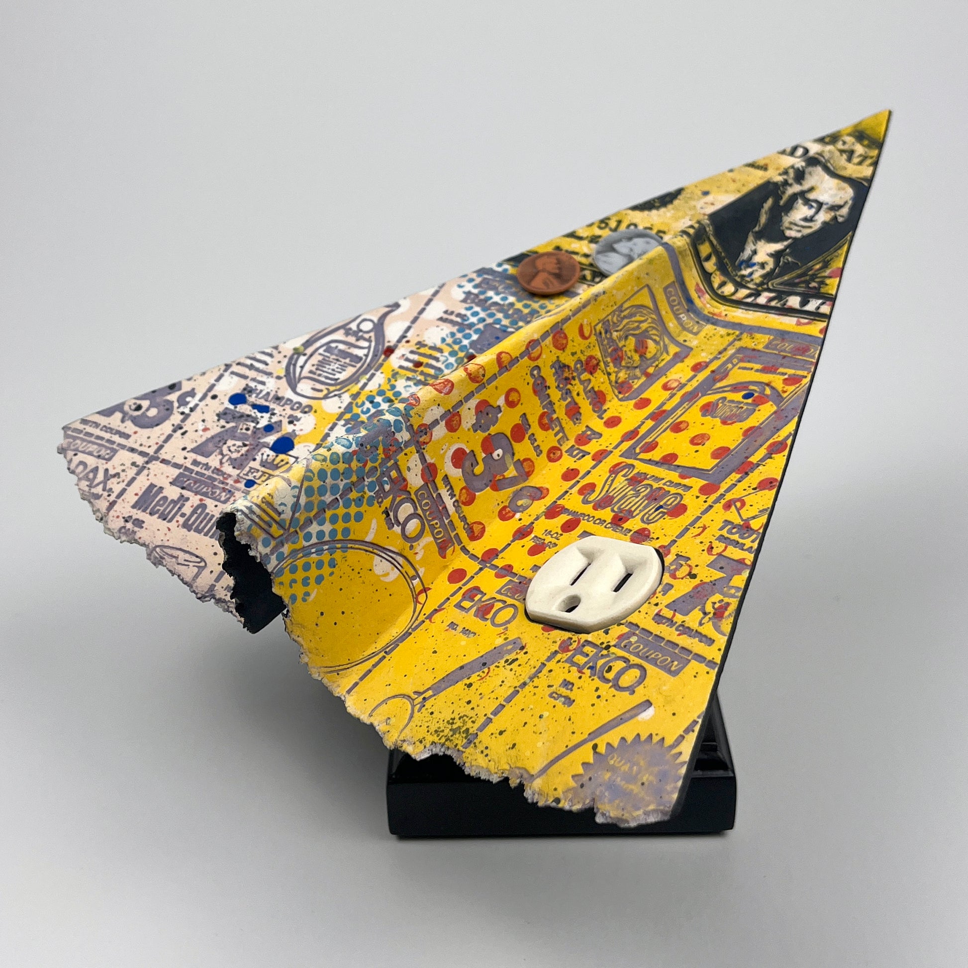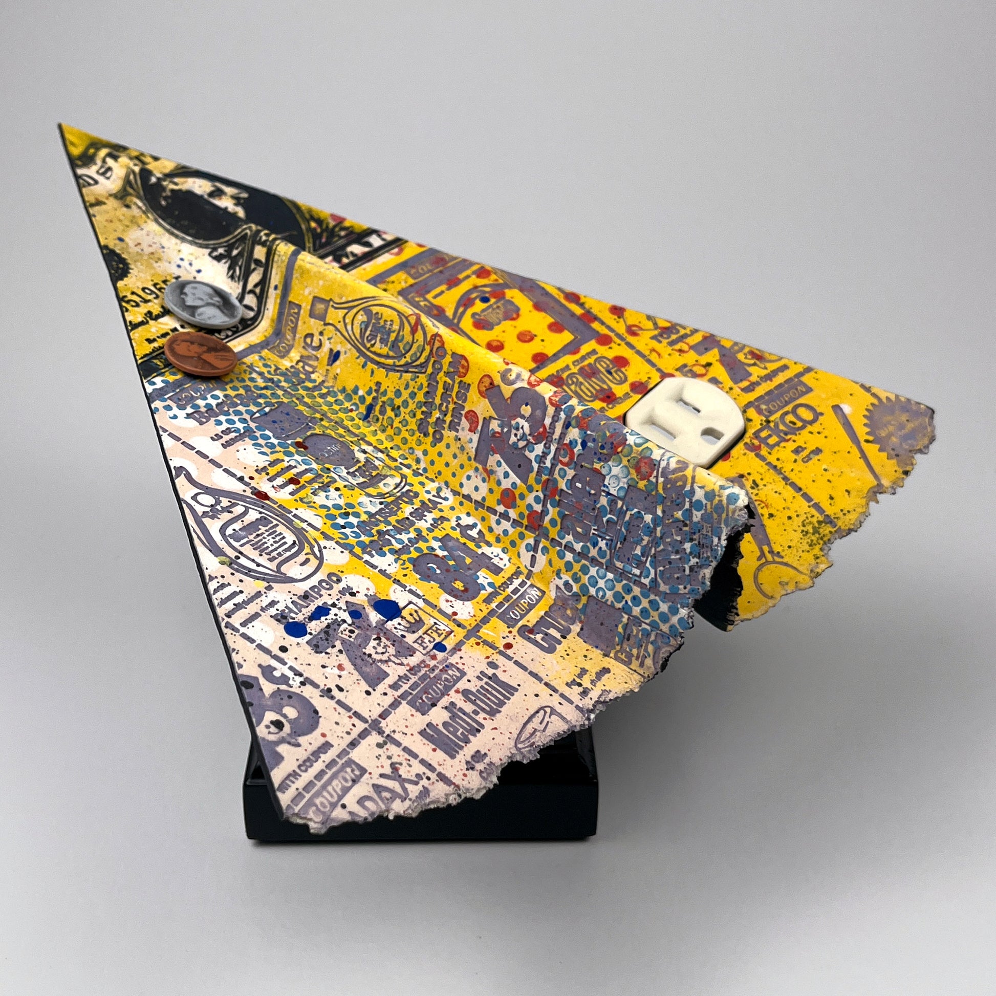HOW ARE THE PLANES MADE? These planes are made from very thin sheets of rolled paper clay. The graphics are impressed with my newly made, or vintage salvaged, printing press plates. The impressed clay sheets are formed into the iconic paper plane dart shape. Trompe l’oeil additions of labels or price stickers or coins or light switches are added. After firing, the impressed text and graphics on the wings and fuselage are washed in underglazes. The underglaze is scrubbed away from the high points, revealing the impressed graphics. Details are also applied with a brush. The clay plane is fired to cone 5 and mounted to a handmade wood stand for display.