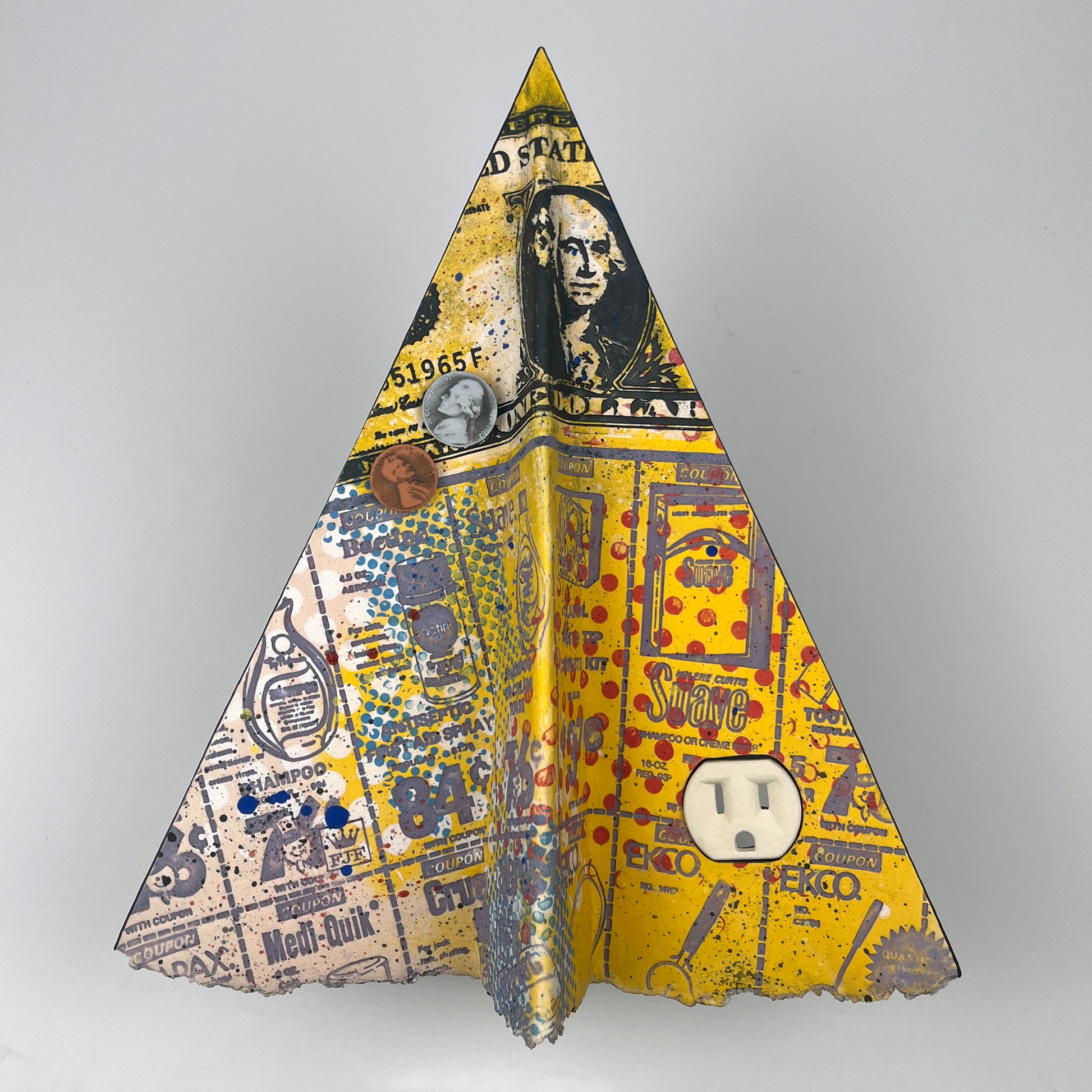 PAPER PLANES: Upon close inspection, these planes are folded from extremely thin sheets of clay. The surfaces of the planes are covered in graphics from vintage newspapers, advertisements, currency, comics, or any variety of paper ephemera. Some planes are glazed in black or red or multiple colors. The plane shapes are similar to the dart-style paper airplanes we made as children — folded from coloring book pages or last week’s math assignment.