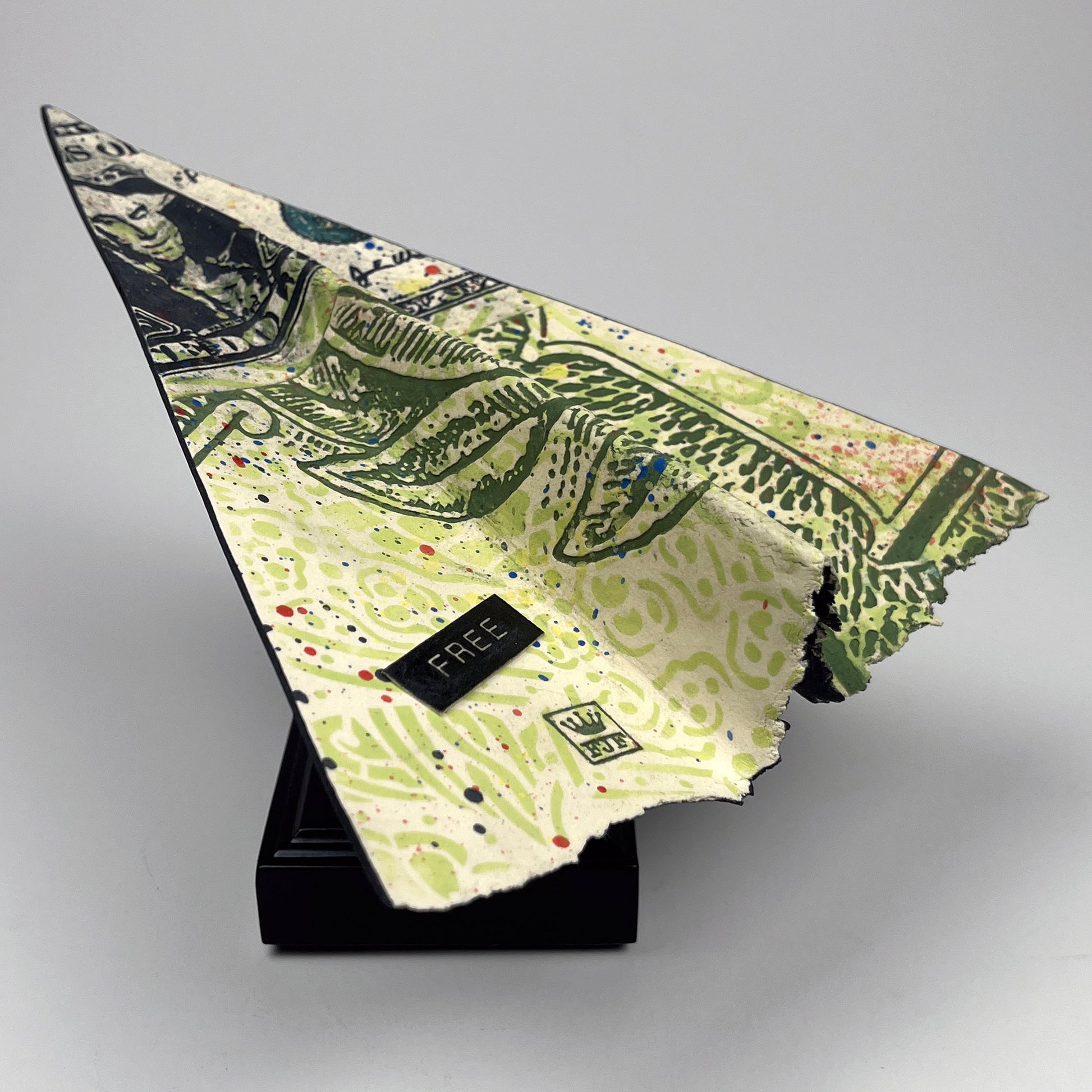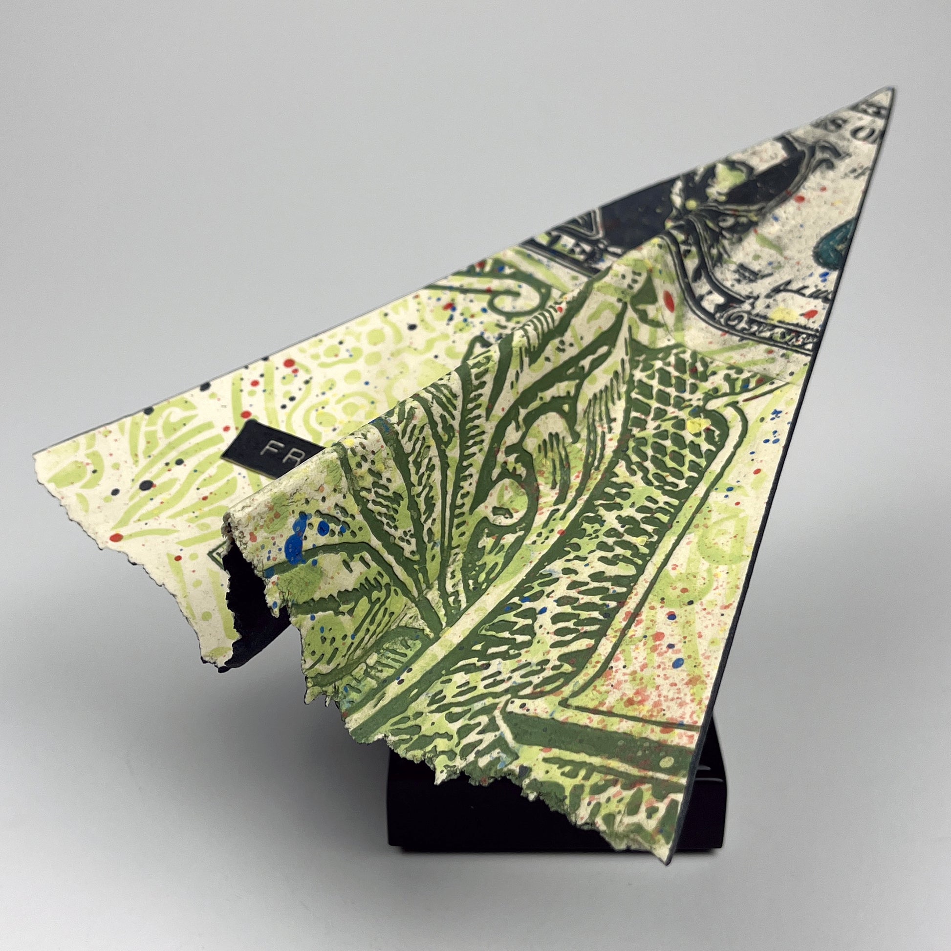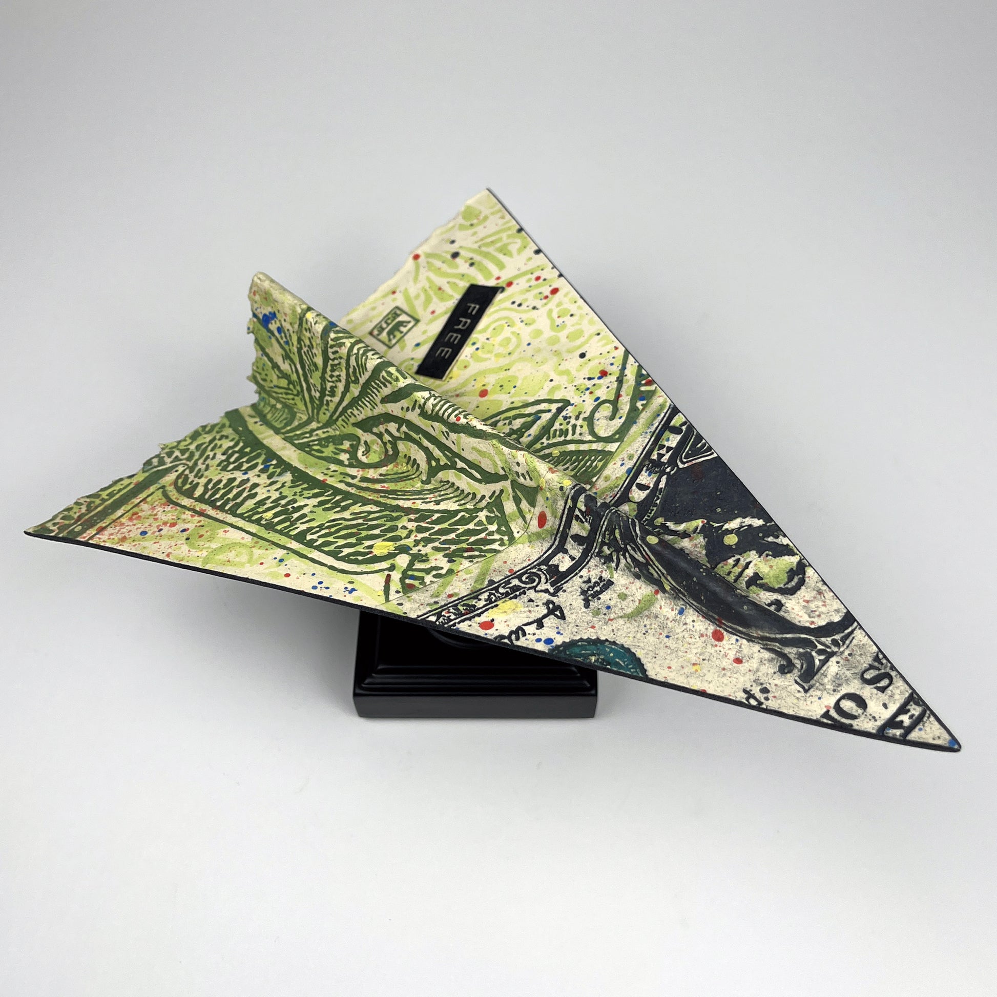 PAPER PLANES: Upon close inspection, these planes are folded from extremely thin sheets of clay. The surfaces of the planes are covered in graphics from vintage newspapers, advertisements, currency, comics, or any variety of paper ephemera. Some planes are glazed in black or red or multiple colors. The plane shapes are similar to the dart-style paper airplanes we made as children — folded from coloring book pages or last week’s math assignment.