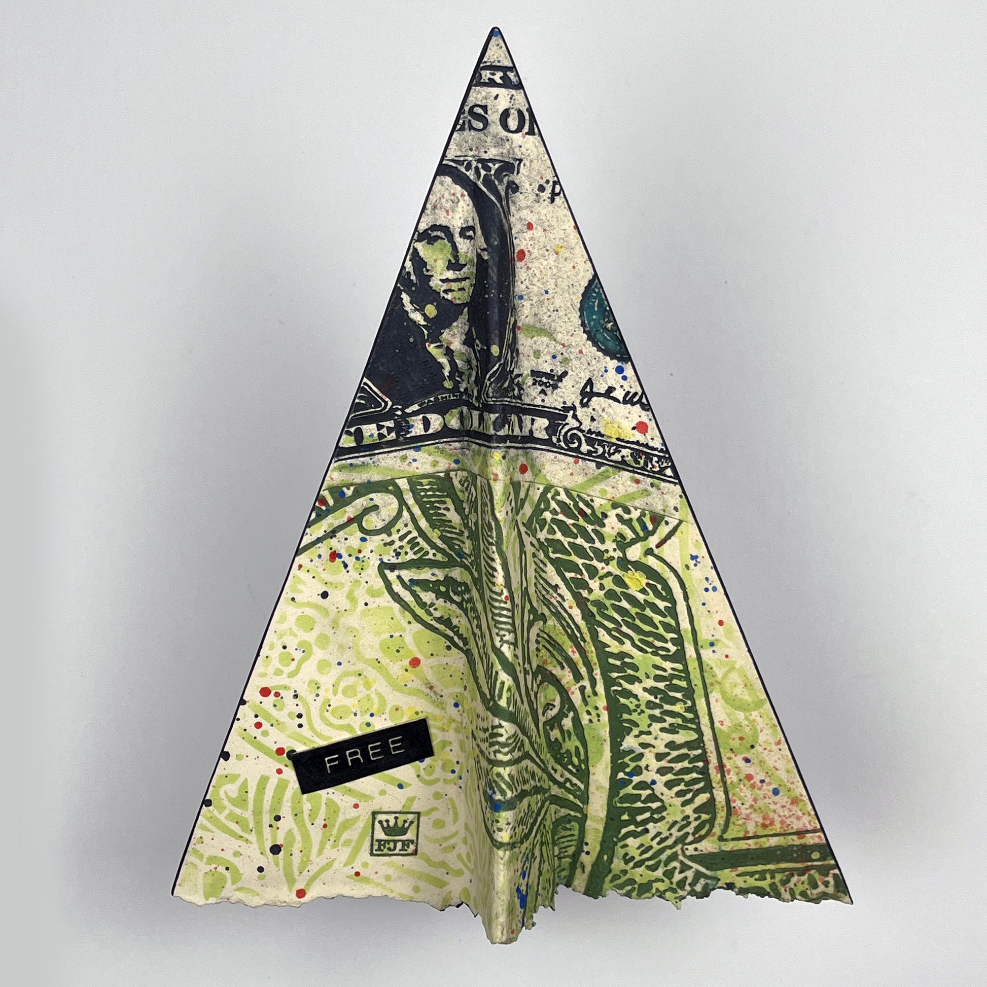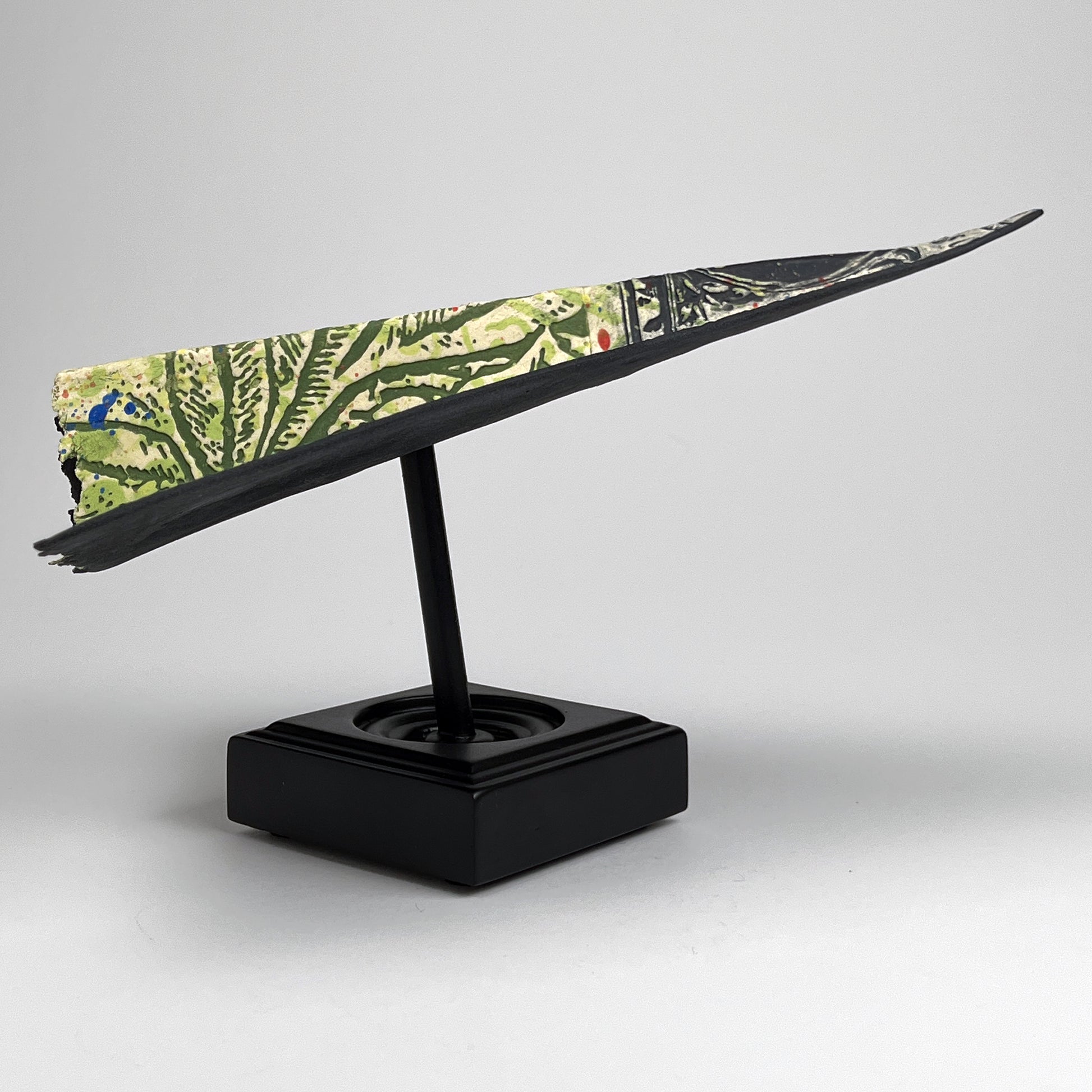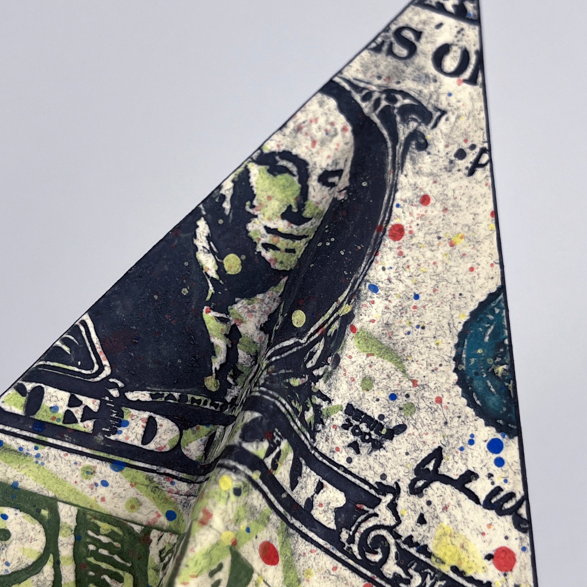 PAPER PLANES: Upon close inspection, these planes are folded from extremely thin sheets of clay. The surfaces of the planes are covered in graphics from vintage newspapers, advertisements, currency, comics, or any variety of paper ephemera. Some planes are glazed in black or red or multiple colors. The plane shapes are similar to the dart-style paper airplanes we made as children — folded from coloring book pages or last week’s math assignment.