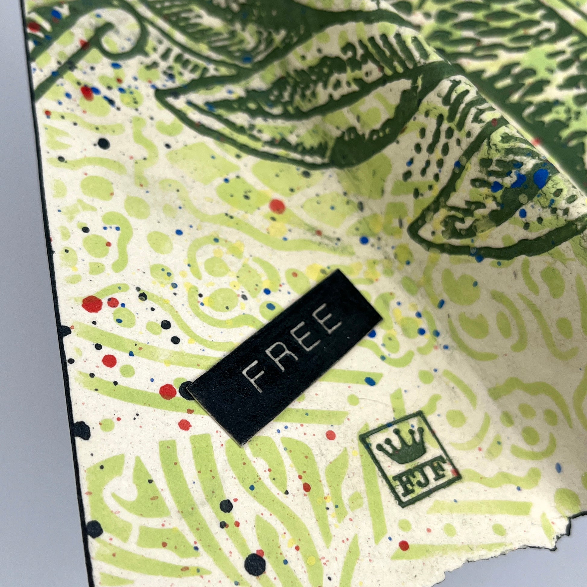 HOW ARE THE PLANES MADE? These planes are made from very thin sheets of rolled paper clay. The graphics are impressed with my newly made, or vintage salvaged, printing press plates. The impressed clay sheets are formed into the iconic paper plane dart shape. After firing, the impressed text and graphics on the wings and fuselage are washed in glazes. The glaze is scrubbed away from the high points, revealing the impressed graphics. Details are also applied with a brush. The clay plane is fired to cone 5 and mounted to a handmade wood stand for display.