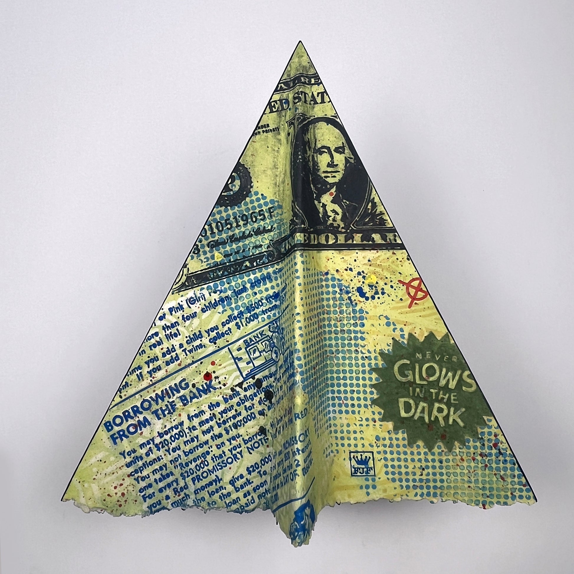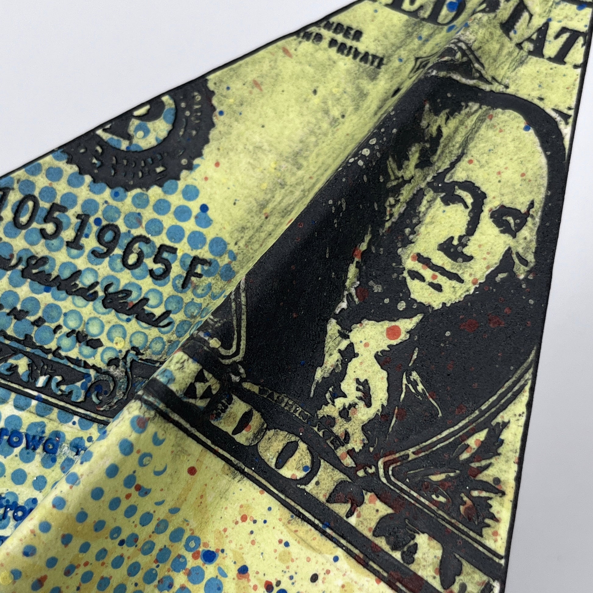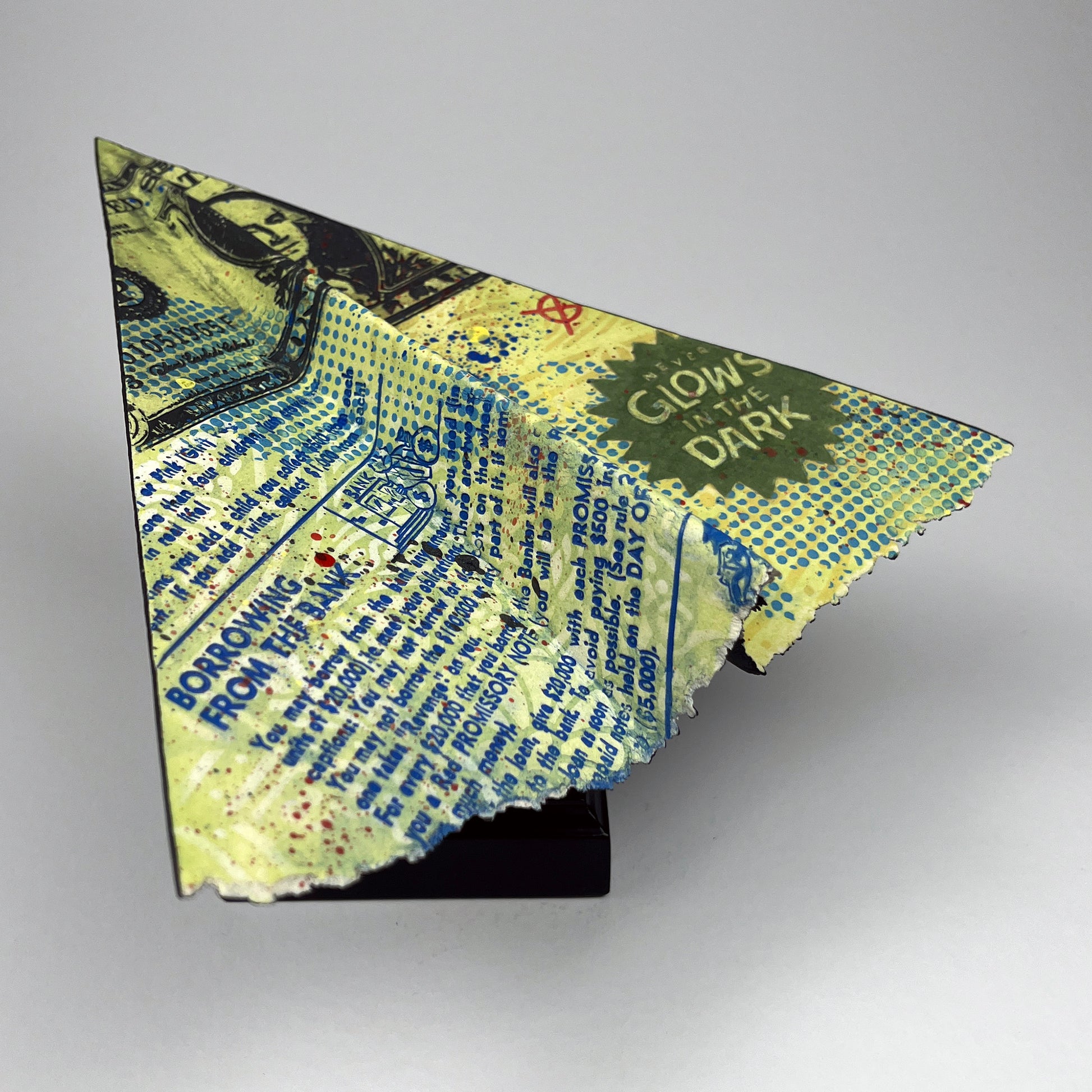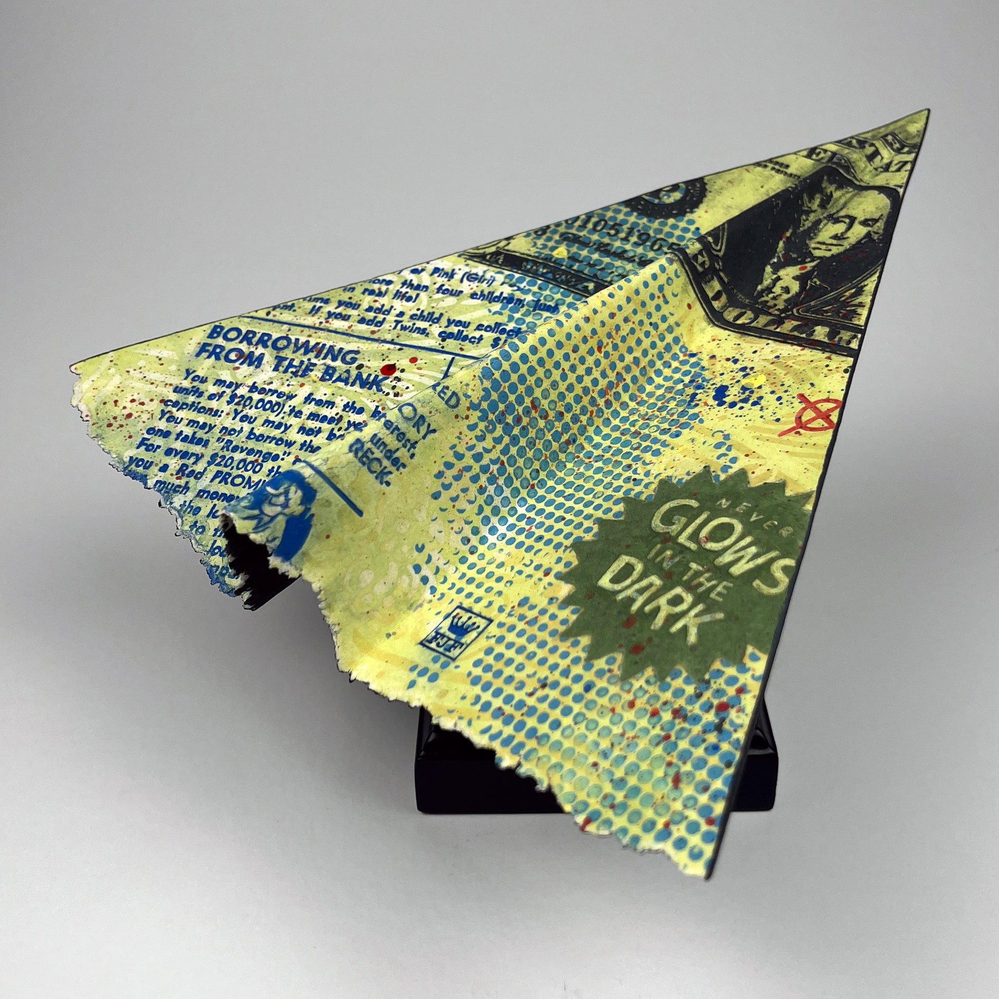 PAPER PLANES: Upon close inspection, these planes are folded from extremely thin sheets of clay. The surfaces of the planes are covered in graphics from vintage newspapers, advertisements, currency, comics, or any variety of paper ephemera. Some planes are glazed in black or red or multiple colors. The plane shapes are similar to the dart-style paper airplanes we made as children — folded from coloring book pages or last week’s math assignment.