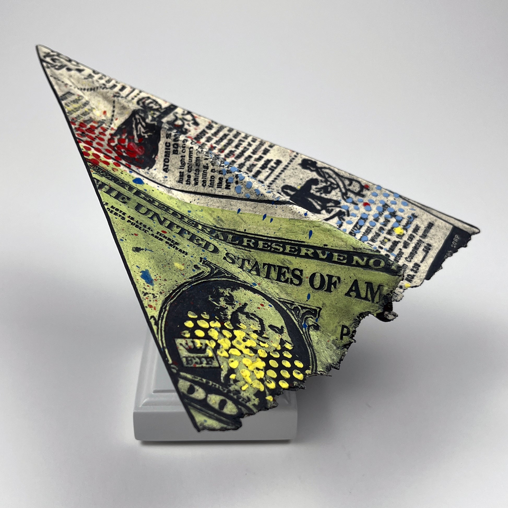 PAPER PLANES: Upon close inspection, these planes are folded from extremely thin sheets of clay. The surfaces of the planes are covered in graphics from vintage newspapers, advertisements, currency, comics, or any variety of paper ephemera. Some planes are glazed in black or red or multiple colors. The plane shapes are similar to the dart-style paper airplanes we made as children — folded from coloring book pages or last week’s math assignment.