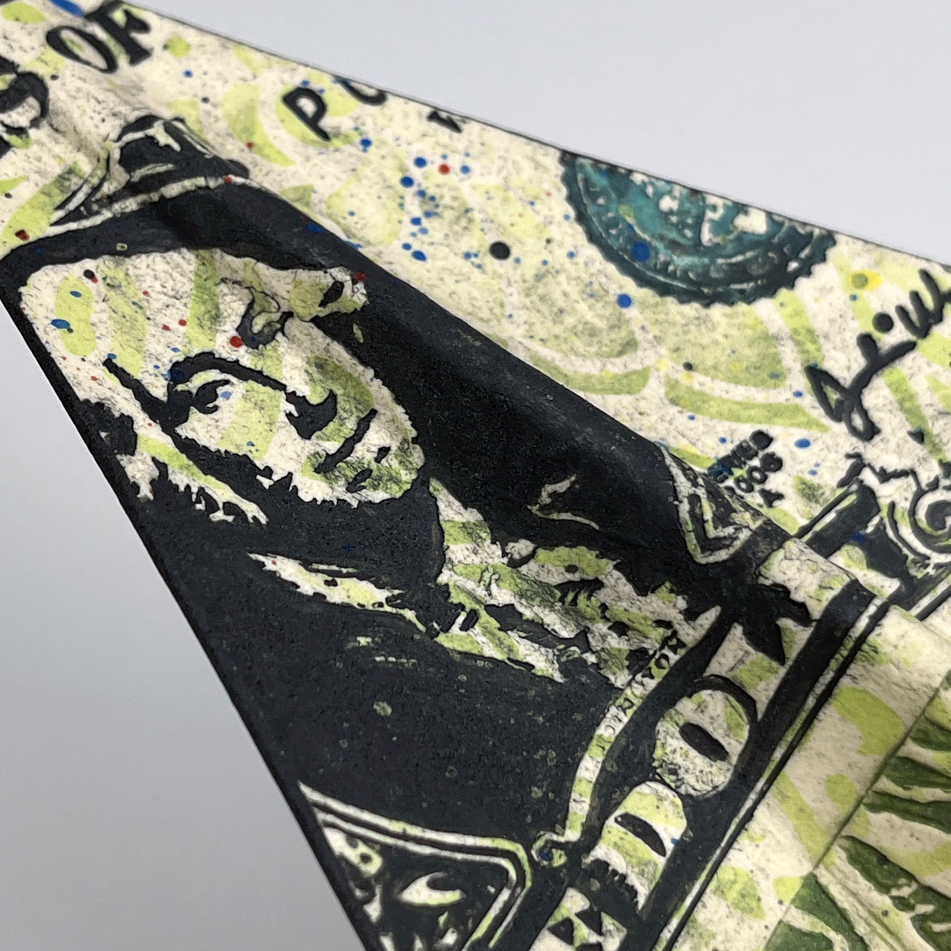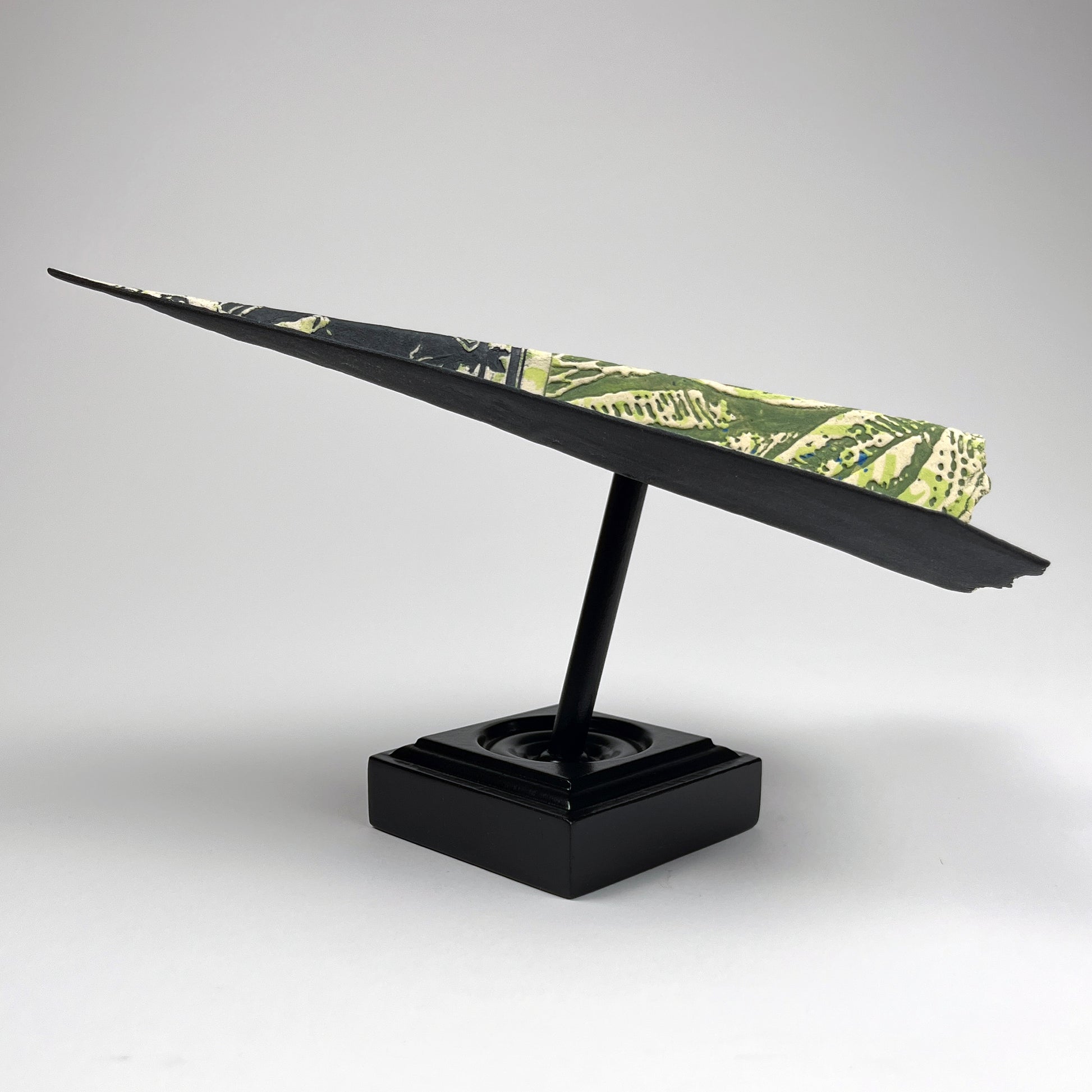 HOW ARE THE PLANES MADE? These planes are made from very thin sheets of rolled paper clay. The graphics are impressed with my newly made, or vintage salvaged, printing press plates. The impressed clay sheets are formed into the iconic paper plane dart shape. Trompe l’oeil additions of labels or price stickers or coins or light switches are added. After firing, the impressed text and graphics on the wings and fuselage are washed in underglazes. The underglaze is scrubbed away from the high points, revealing the impressed graphics. Details are also applied with a brush. The clay plane is fired to cone 5 and mounted to a handmade wood stand for display.