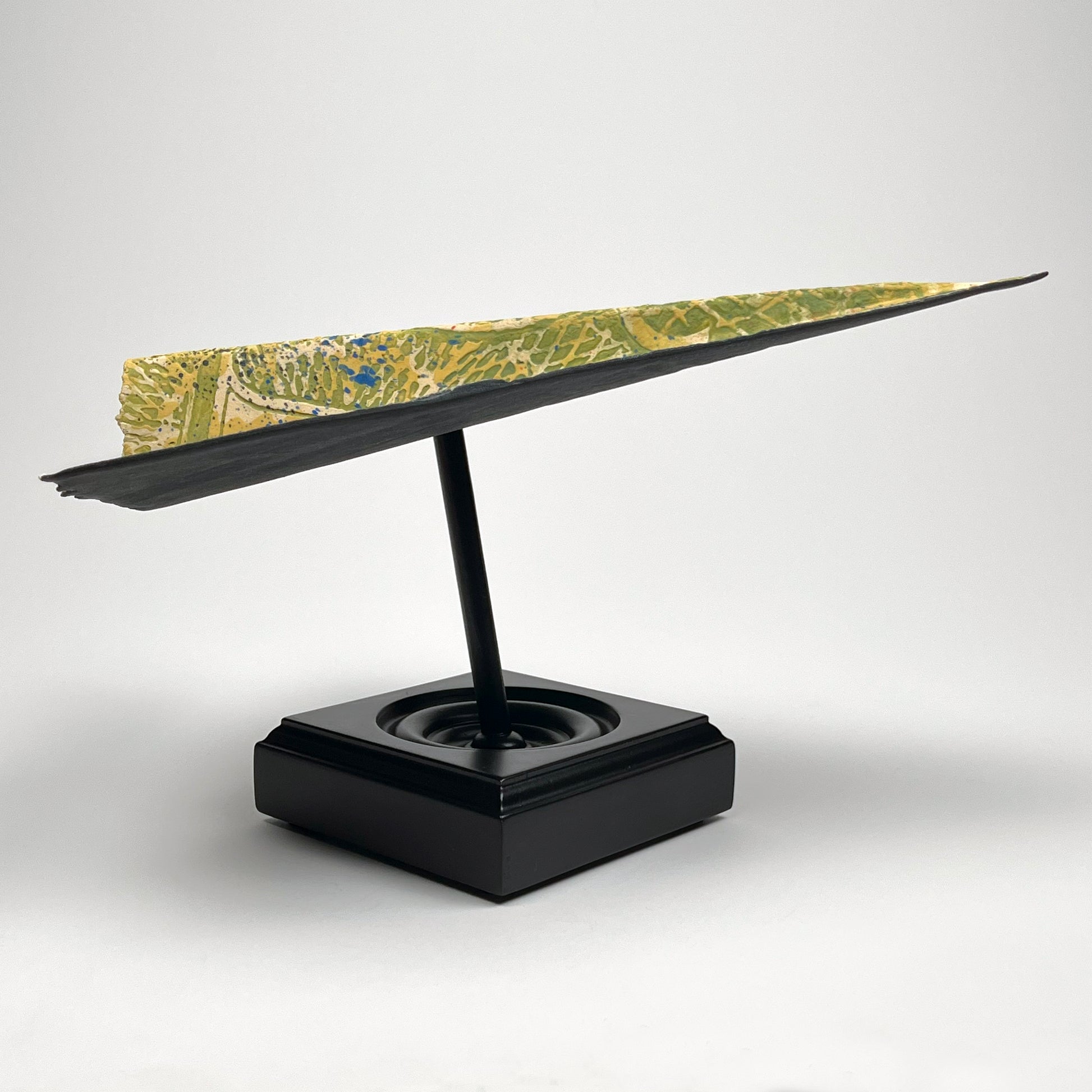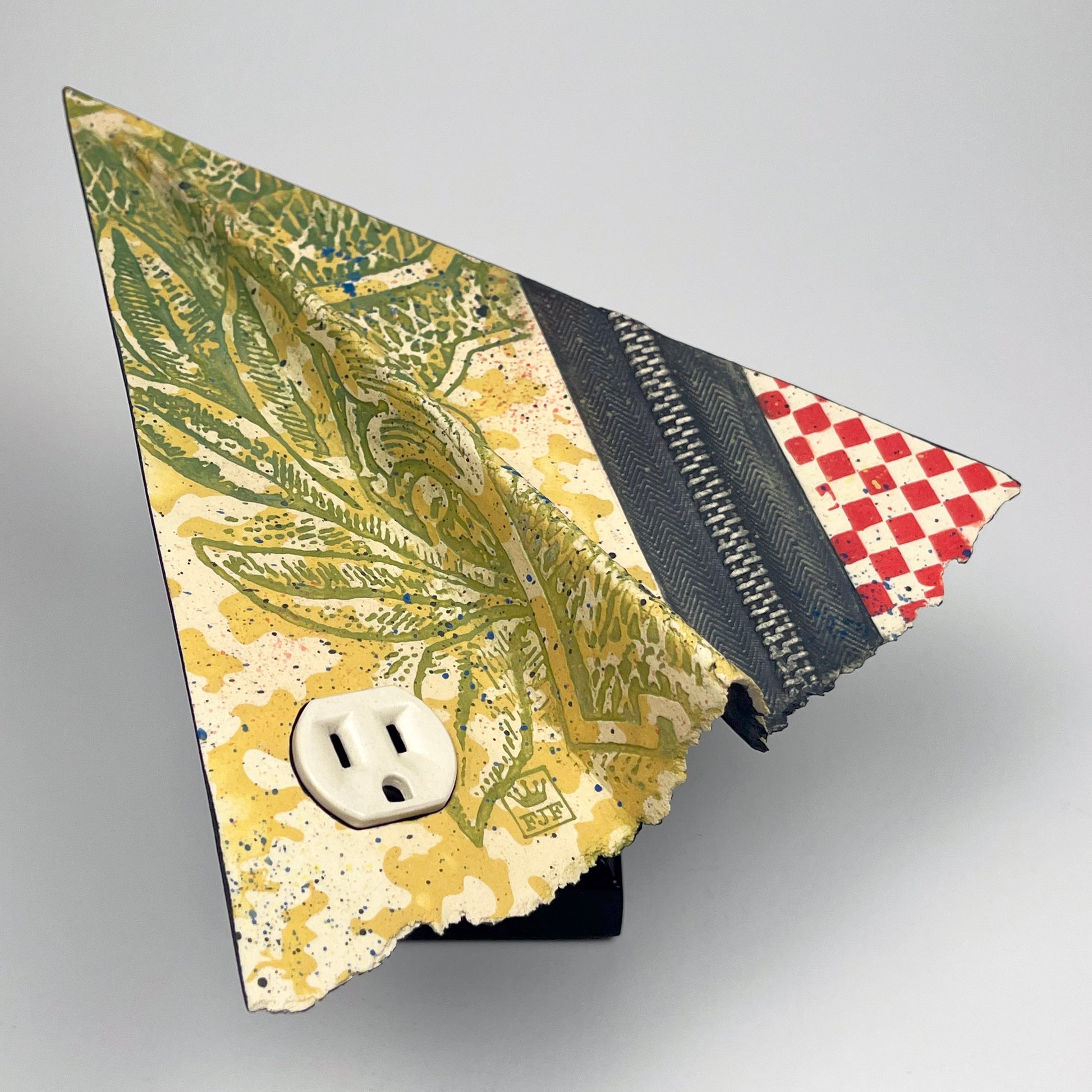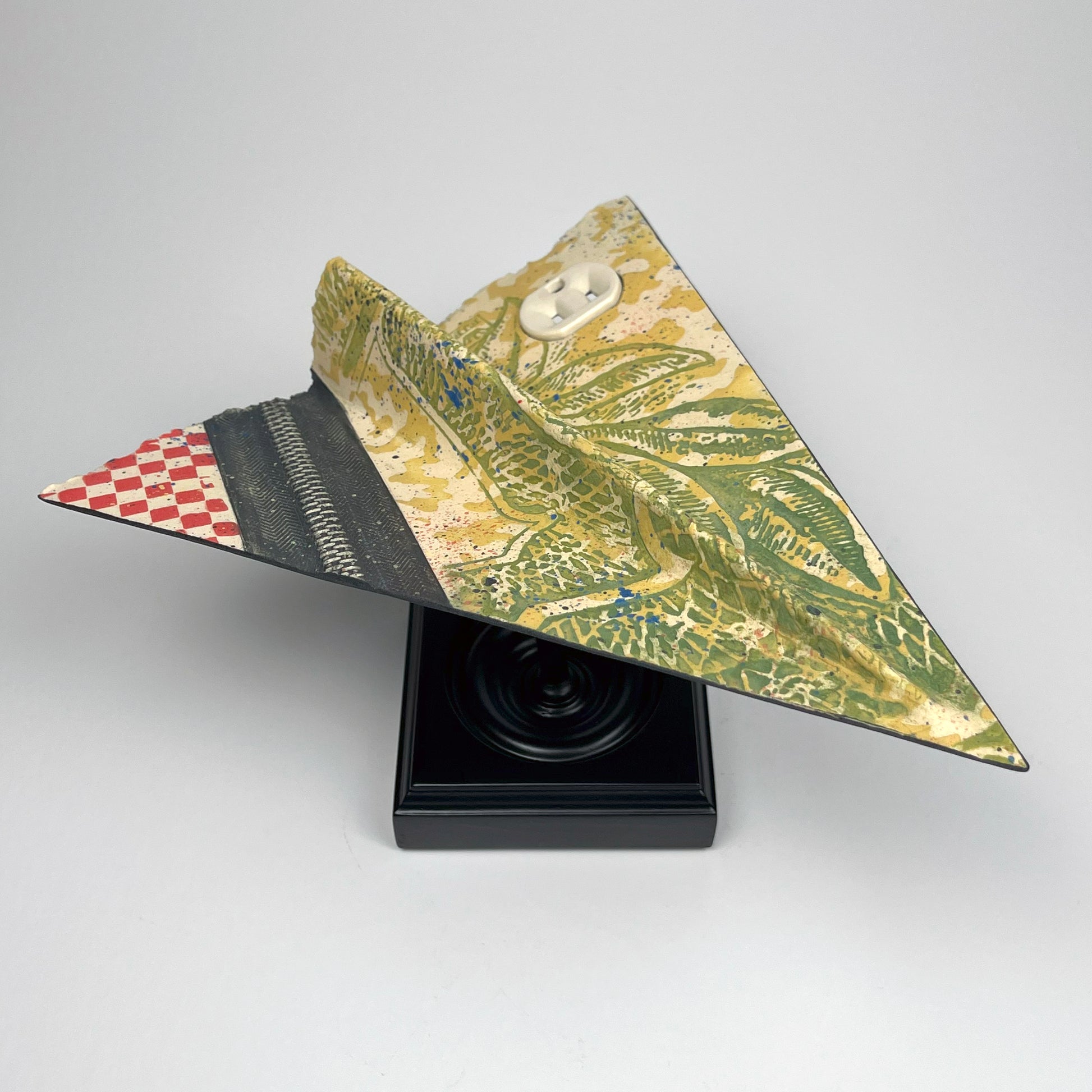PAPER PLANES: Upon close inspection, these planes are folded from extremely thin sheets of clay. The surfaces of the planes are covered in graphics from vintage newspapers, advertisements, currency, comics, or any variety of paper ephemera. Some planes are glazed in black or red or multiple colors. The plane shapes are similar to the dart-style paper airplanes we made as children — folded from coloring book pages or last week’s math assignment.