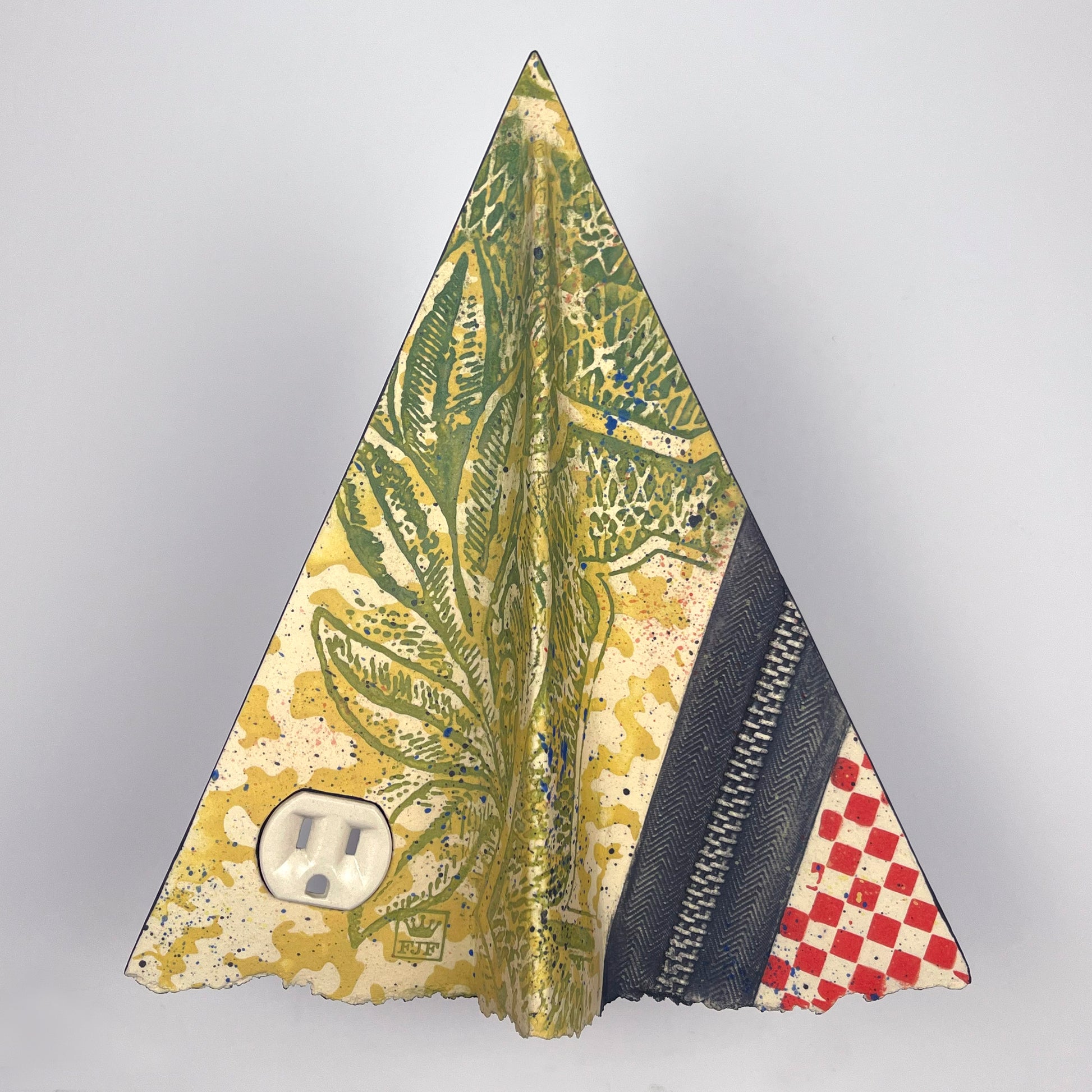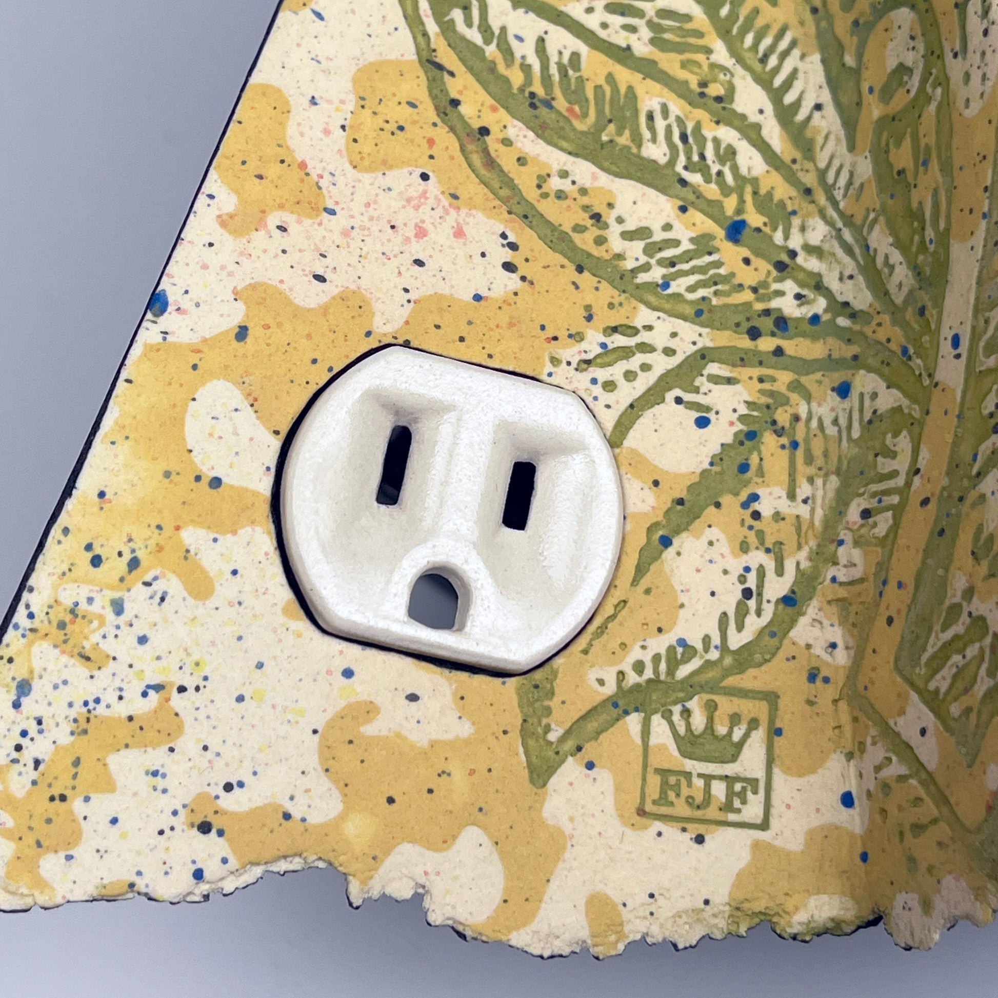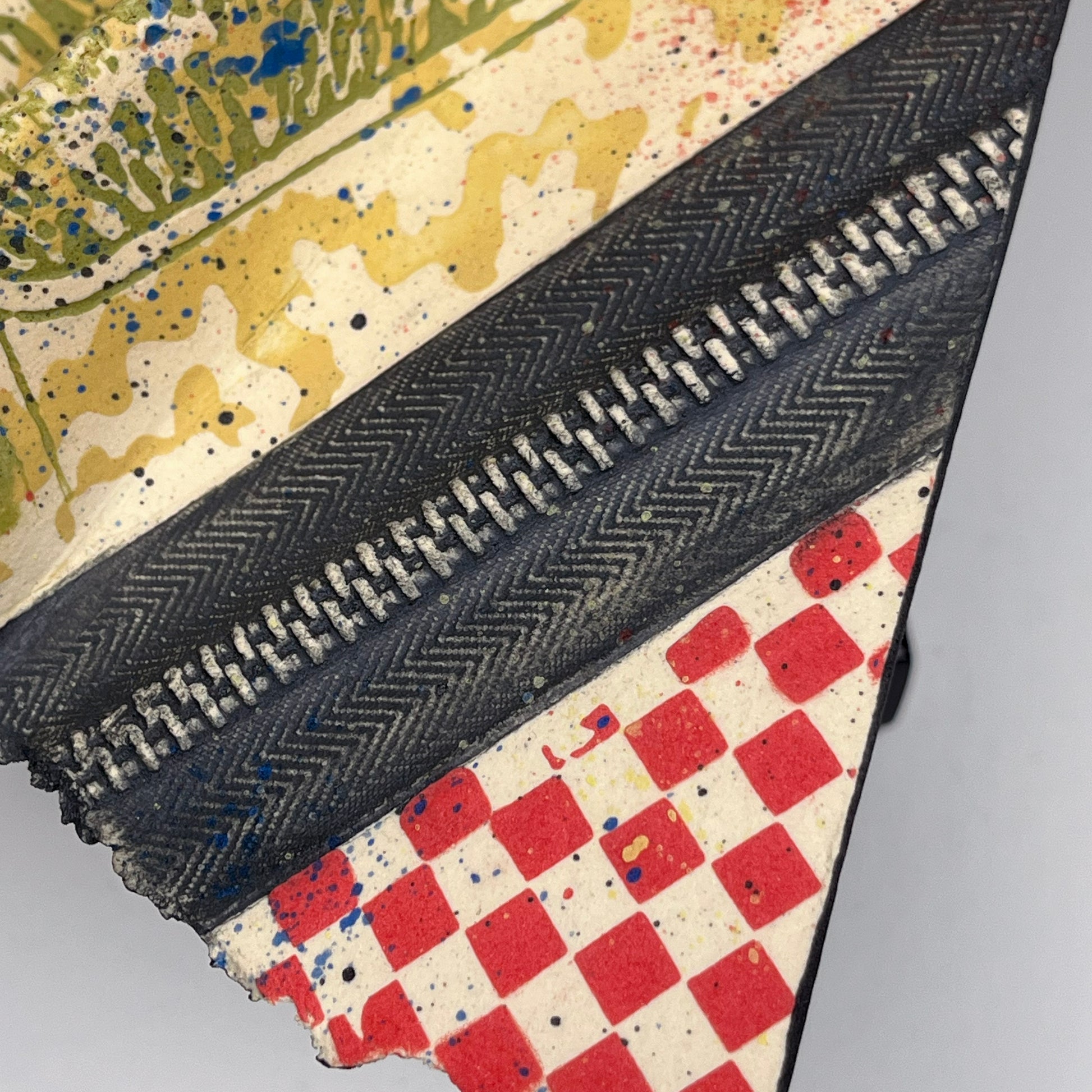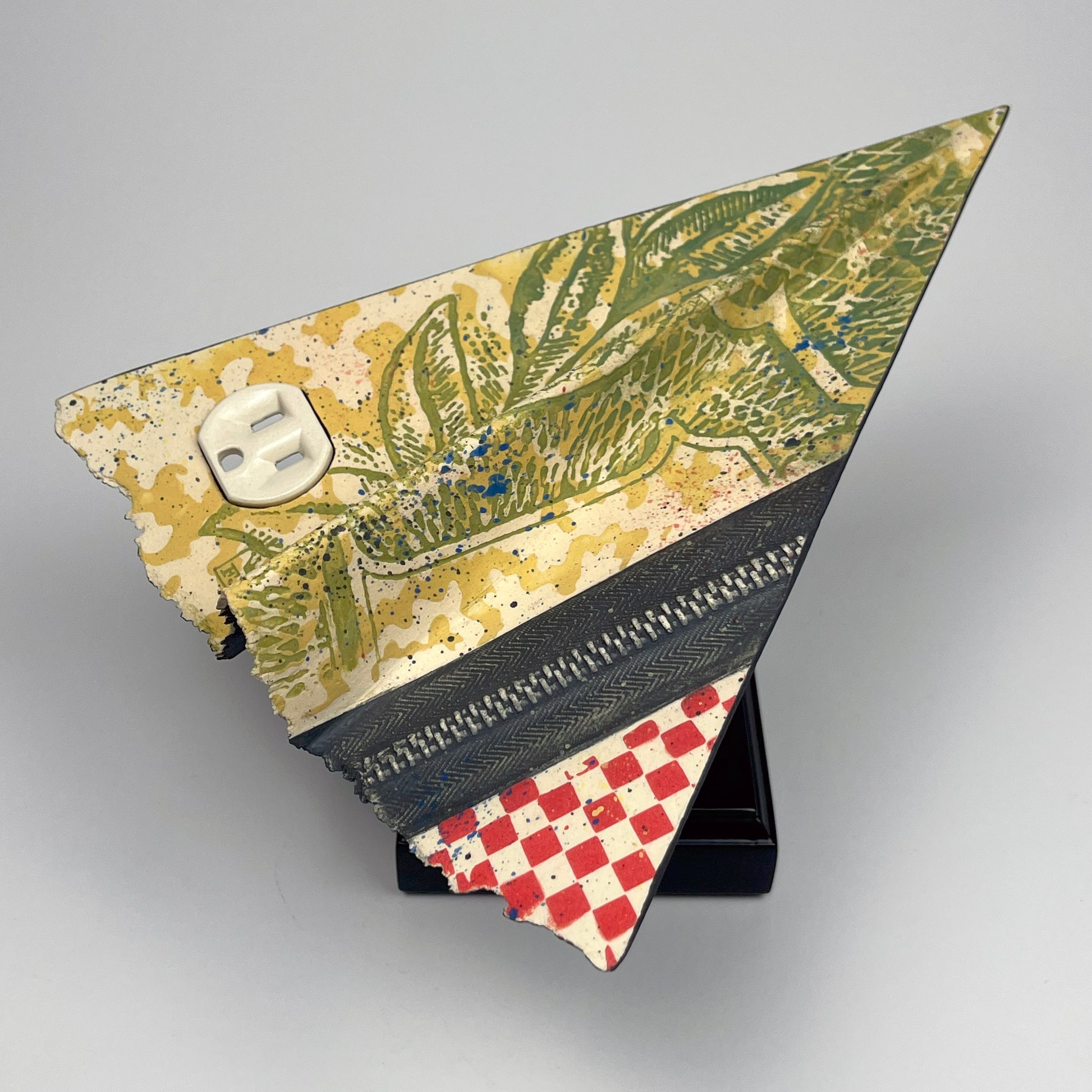 PAPER PLANES: Upon close inspection, these planes are folded from extremely thin sheets of clay. The surfaces of the planes are covered in graphics from vintage newspapers, advertisements, currency, comics, or any variety of paper ephemera. Some planes are glazed in black or red or multiple colors. The plane shapes are similar to the dart-style paper airplanes we made as children — folded from coloring book pages or last week’s math assignment.