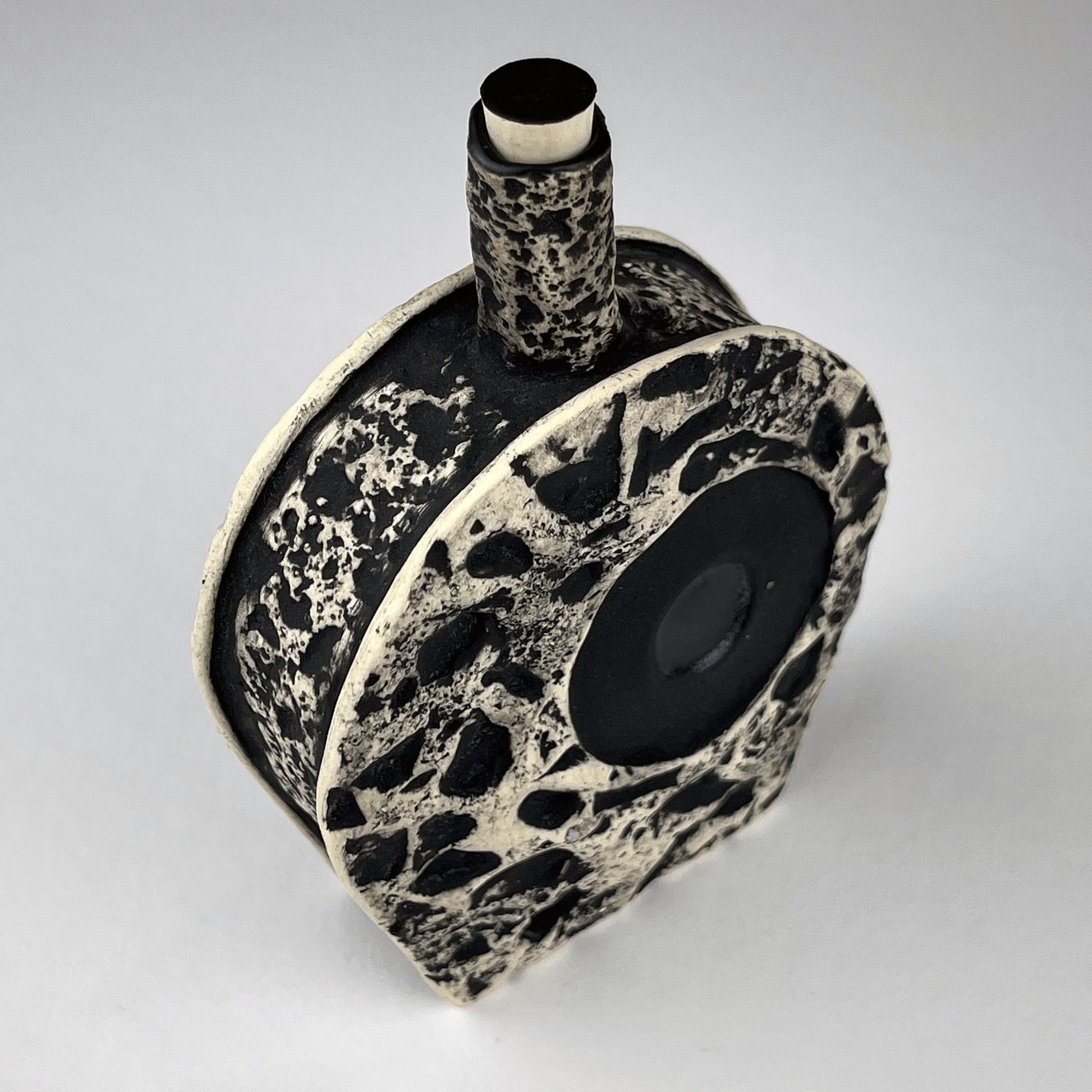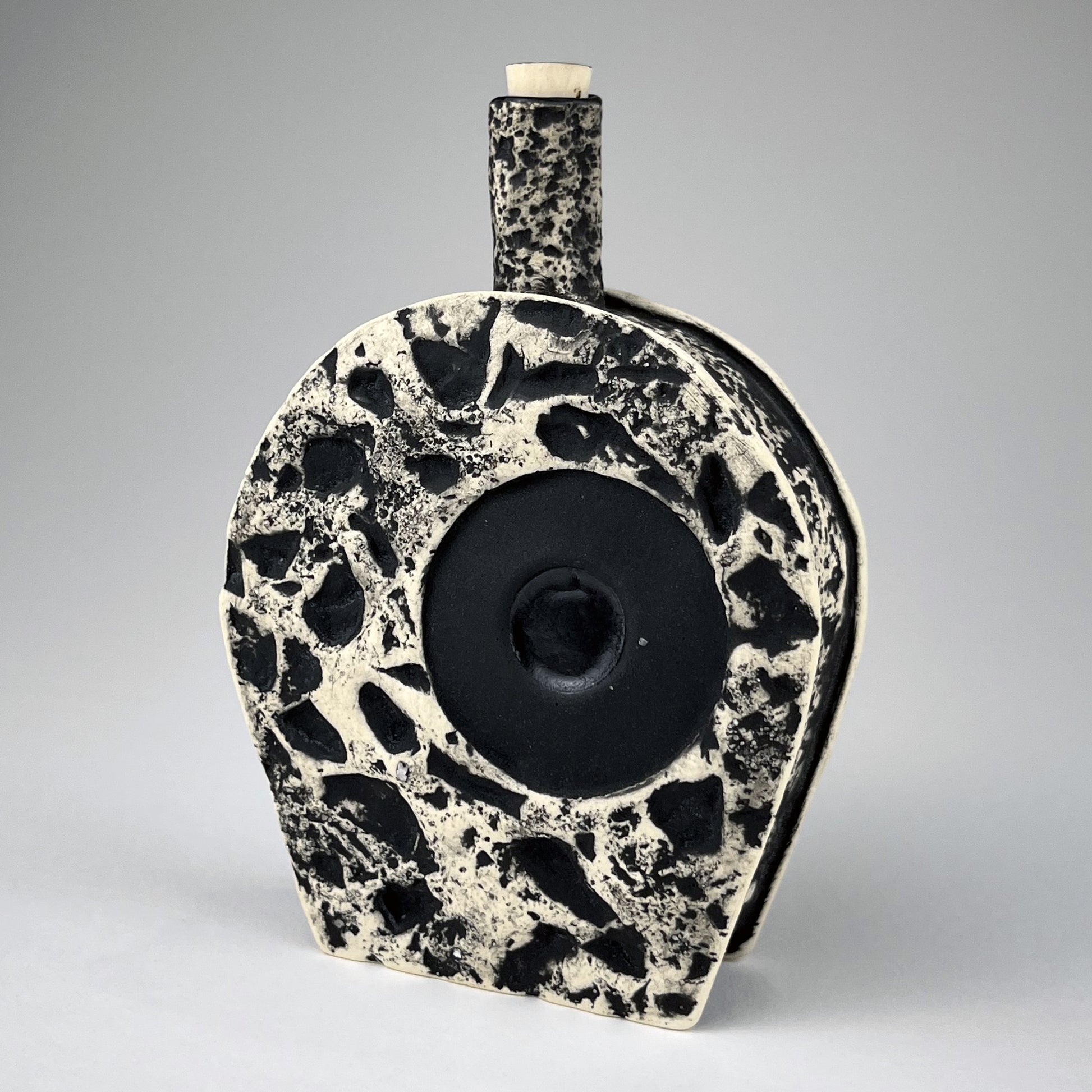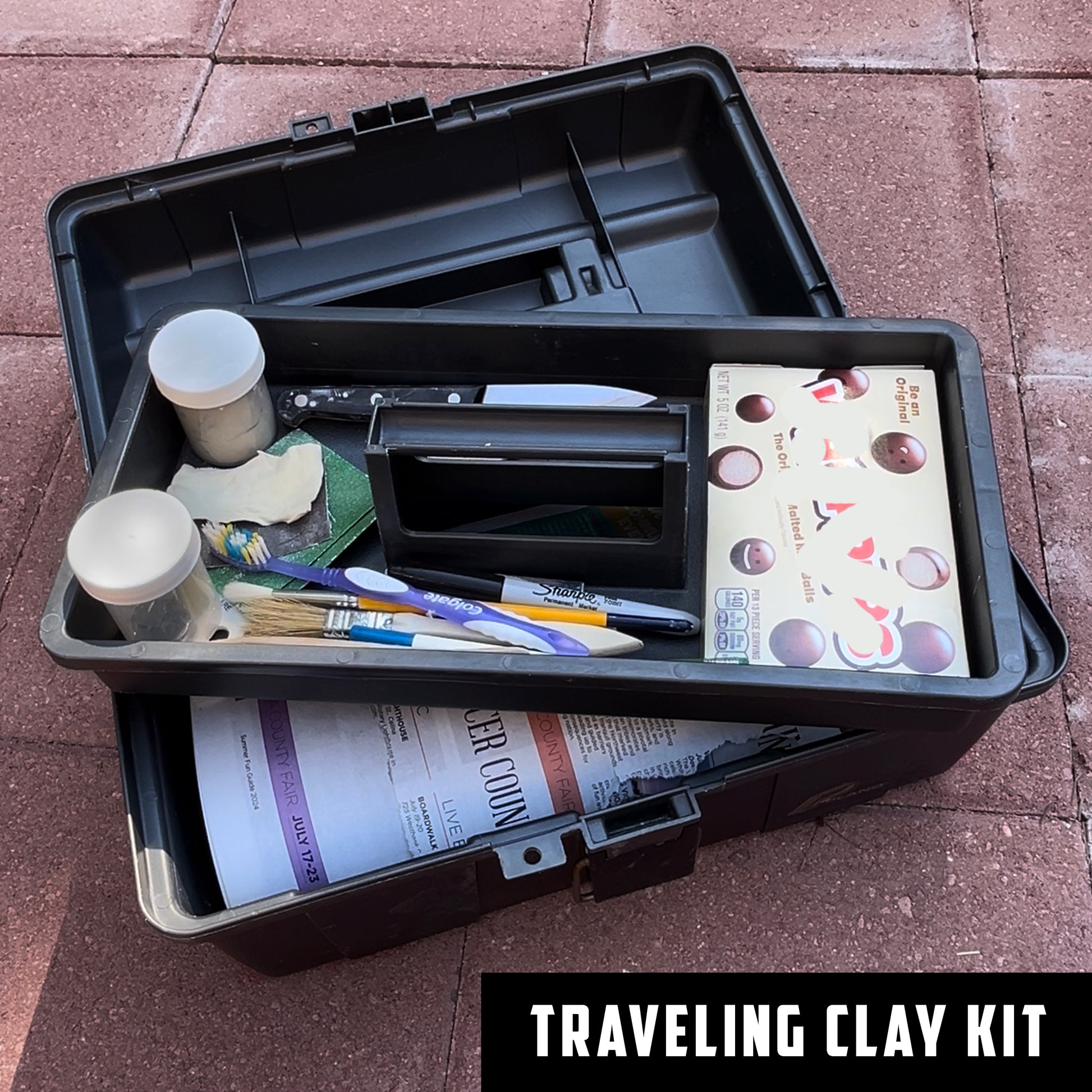 How are they made? Using my Traveling Clay Kit, I can take my ceramic art studio with me out into the world. The kit is an old fishing box containing all the basic items needed to create a simple slab bottle. This approach is a ceramic art version of the landscape painter's Plein Air Painting. It is my way to directly capture authentic textures from the raw world onto clay and turn those dimensional imprints into a functional, interesting, hopefully attractive, yet oddly curious ceramic artwork. During the day I will make a clay impression and later I build out a flask in the hotel room or wherever I can find space. I am not chasing perfection - I am interested in the process of exploring ways to invigorate the clay surface ... including all the grit and grunge I may encounter! For glazing, I only use a matte black underglaze to highlight the nooks, crannies, bulges, and recesses. For this aesthetic, the black underglaze contrasts against the clay body to create drama, simplicity, and purity.