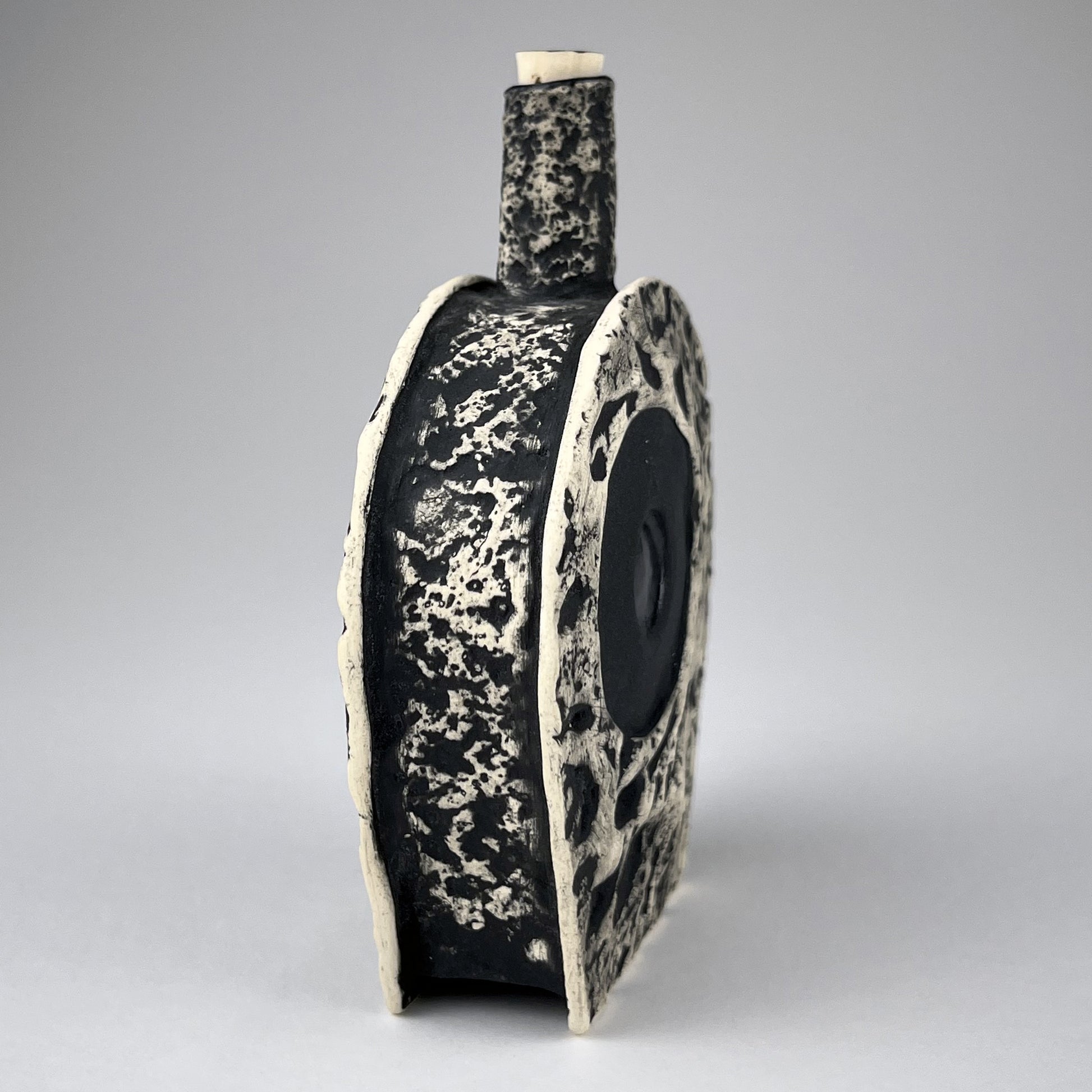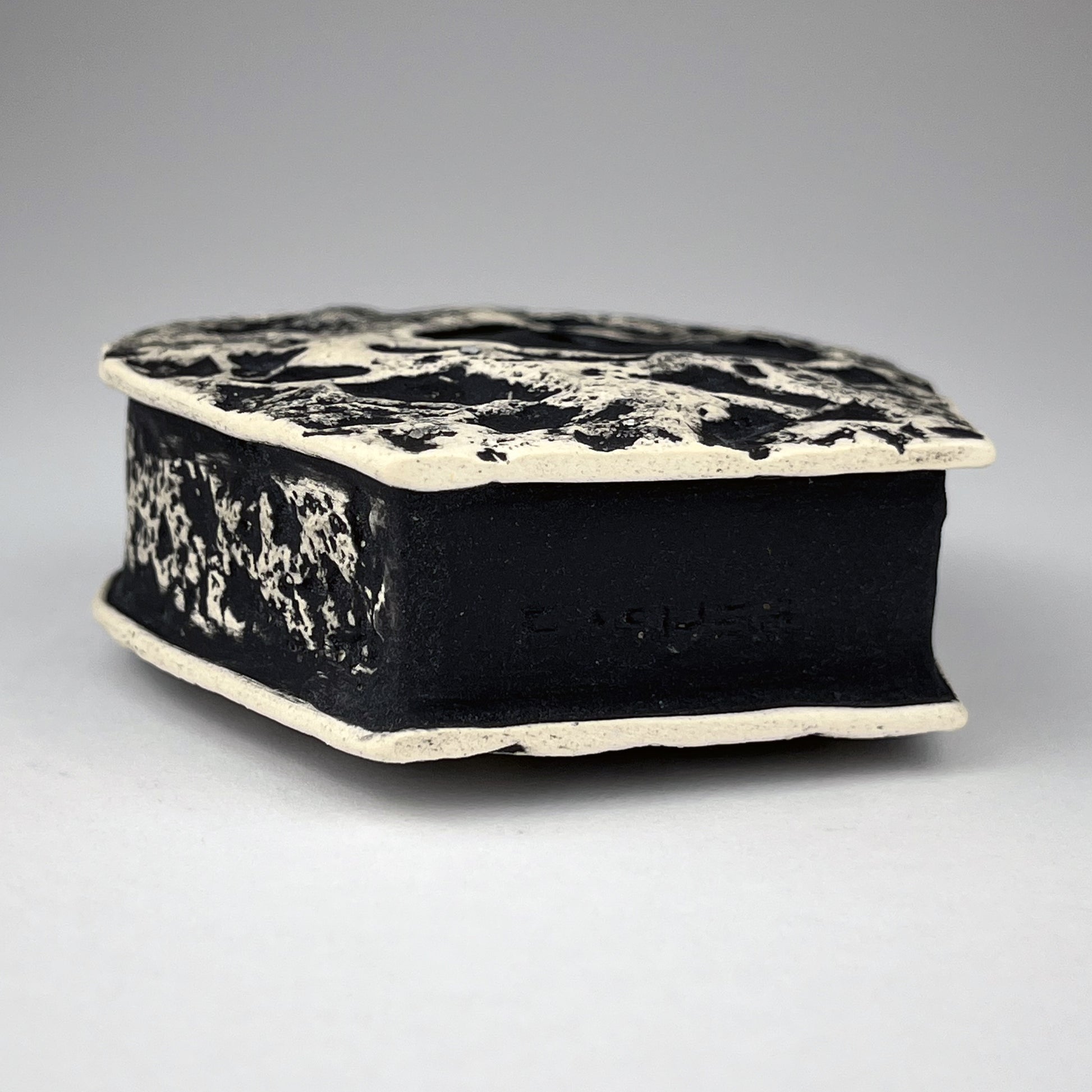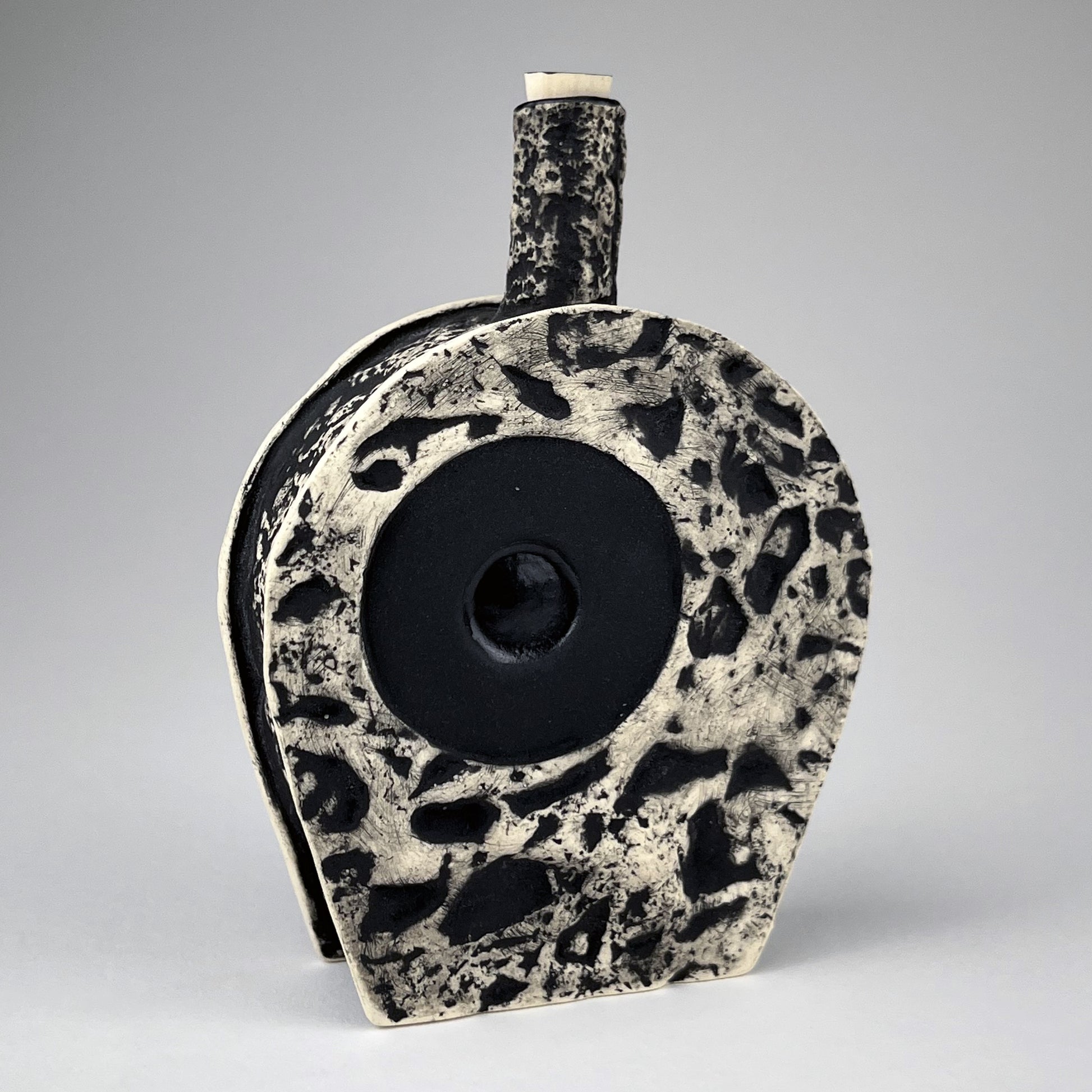 How are they made? Using my Traveling Clay Kit, I can take my ceramic art studio with me out into the world. The kit is an old fishing box containing all the basic items needed to create a simple slab bottle. This approach is a ceramic art version of the landscape painter's Plein Air Painting. It is my way to directly capture authentic textures from the raw world onto clay and turn those dimensional imprints into a functional, interesting, hopefully attractive, yet oddly curious ceramic artwork. During the day I will make a clay impression and later I build out a flask in the hotel room or wherever I can find space. I am not chasing perfection - I am interested in the process of exploring ways to invigorate the clay surface ... including all the grit and grunge I may encounter! For glazing, I only use a matte black underglaze to highlight the nooks, crannies, bulges, and recesses. For this aesthetic, the black underglaze contrasts against the clay body to create drama, simplicity, and purity.